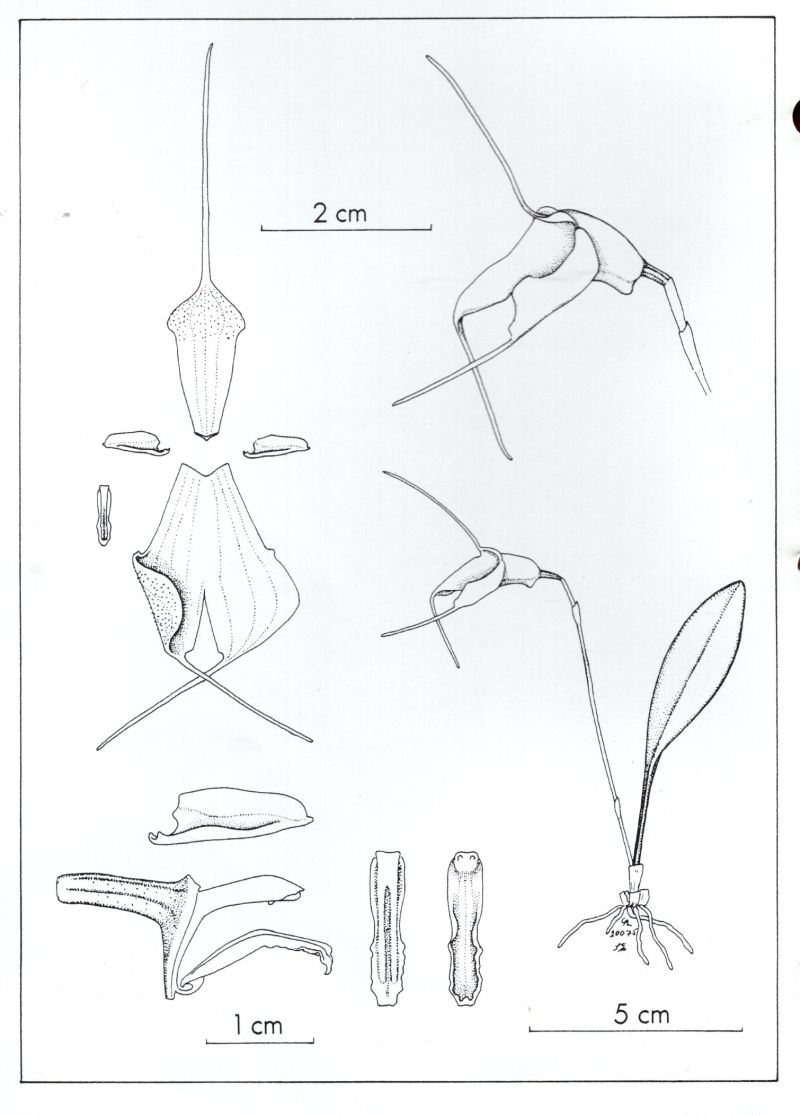 Found in Zamora-Chinchipe province of Ecuador and Peru at elevations around 1700 meters as a mini-miniature sized, cool growing epiphyte with slender, erect, blackish ramicauls enveloped by 2 to 3, tubular sheaths and carrying a single, apical, erect, coriaceous, elliptical, acute, cuneate below into the petiolate base leaf that blooms in the spring on an erect, slender, 2.4" [6 cm] long, single flowered inflorescence arising from the base of the ramicaul with a bract above the base and has a tubular floral bract.