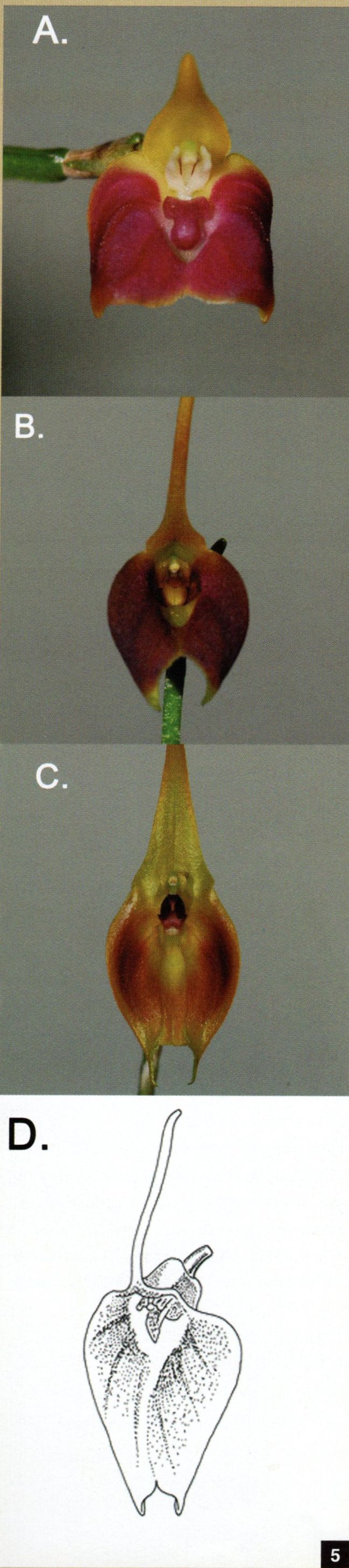 Found in Zamora-Chinchipe province of Ecuador at elevations around 1800 meters as a mini-miniature sized, cool growing caespitose epiphyte with semi-terete, sulcate adaxially, keeled abaxially ramicauls enveloped by 3 sheaths and carrying a single, apical, erect, coriaceous, narrowly elliptic, acute, gradually narrowing below into the petiolate base leaf that blooms in the winter on an erect to horizontal, peduncle triquetrous, 5.6" [14 cm] long, enveloped by 2 close, tubular bracts, congested, successively single, few flowered inflorescence.