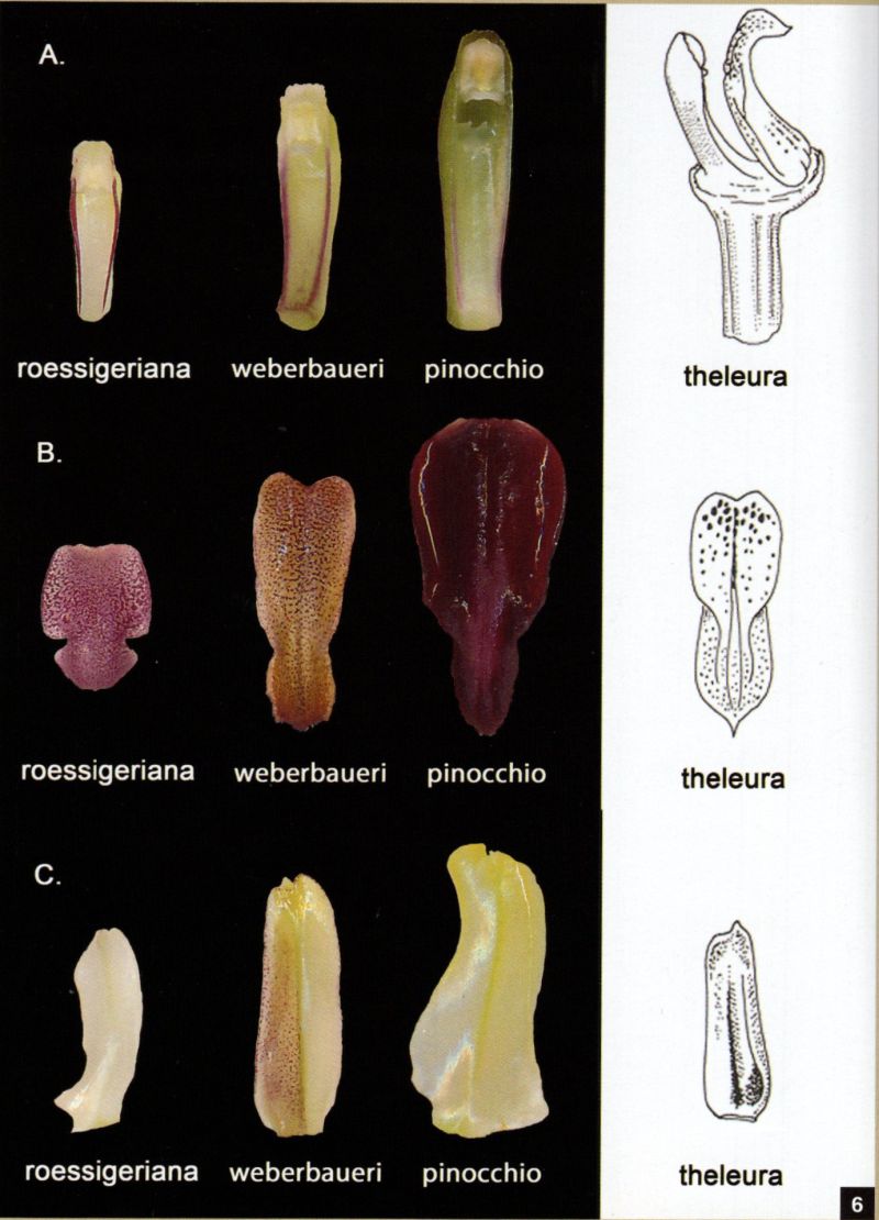 M theleura but differs in the smaller flowers, the petals with a retrorse tooth and the proportionally broader lip." Doucette 2015
