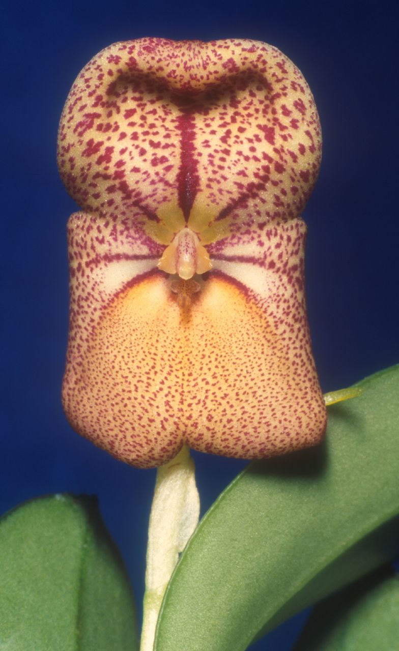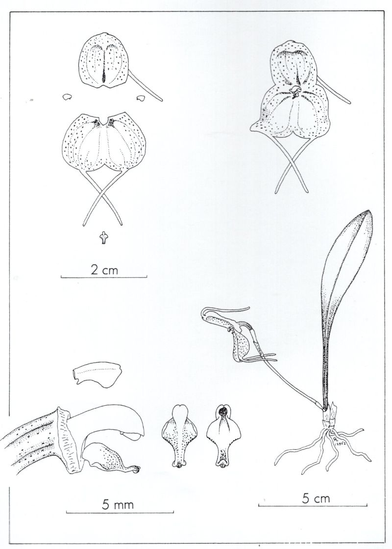 Found in Peru and Bolivia in wet forests at elevations of 1550 to 2200 meters as a mini-miniature sized, cool to cold growing epiphyte with a blackish, erect, slender ramicaul enveloped basally by 2 to 3 tubular sheaths and carrying a single, apical, erect, coriaceous, dark green, mottled with black beneath, elliptical-obovate, subacute to acute leaf that is cuneate into the blackish petiole and blooms on a slender, suberect to subhorizontal, 2" [5 cm] long, single flowered inflorescence with a downward facing flower occuring in the spring.