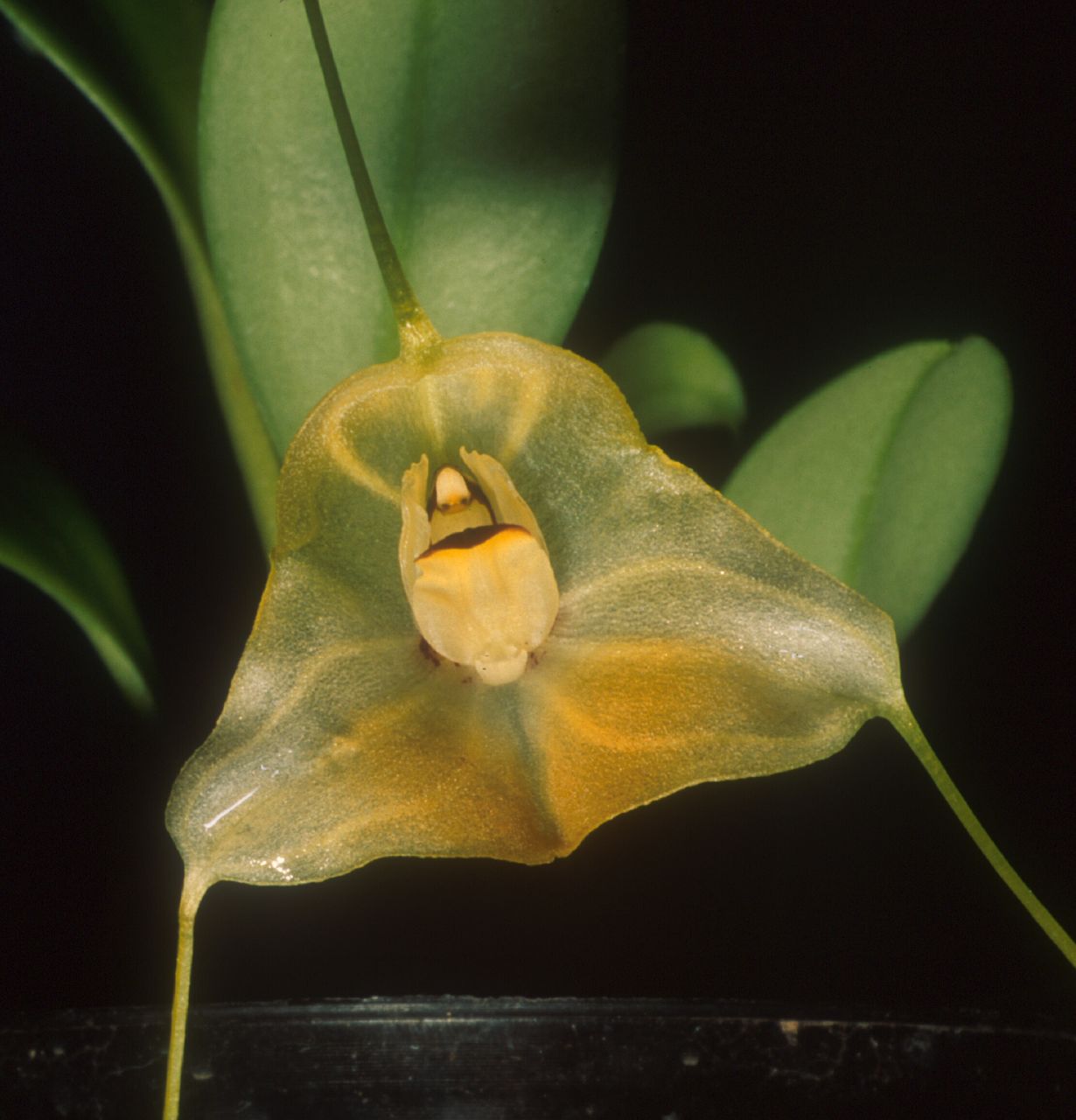 Found in southern Ecuador in cloud forests on mossy trees and is found at an elevation of 1900 to 2500 meters as a mini-miniature sized, cool to cold growing epiphyte with blackish, slender ramicauls enveloped basallly by 2 to 3 tubular sheaths carrying a single, apical, erect, coriaceous, elliptical, subacute to obtuse leaf that is cuneate below into the petiolate base which blooms at any time of the year on a lateral, slender, 1" to 1 1/4" [2.5 to 3 cm] long inflorescence arising from low on the ramicaul with a bract near the base and a tubular floral bract carrying the single flower that is held below the leaves.