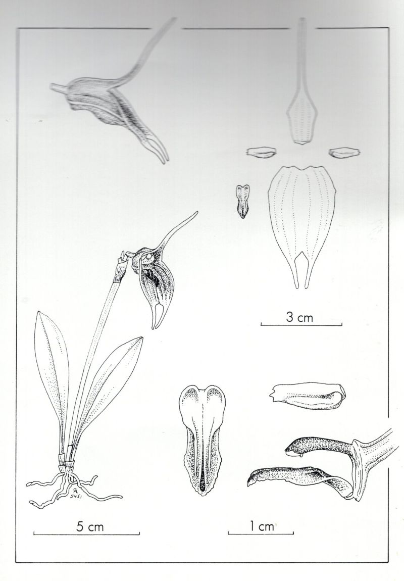 Found in southern Ecuador in forests at elevations around 1600 meters as a mini-miniature sized, cool growing epiphytic orchid with erect stout ramicauls enveloped by 2 to 3, loose, tubular sheaths and carrying a single, apical, erect, coriaceous, elliptical, acute, cuneate below into the petiolate base leaf that blooms in the late winter and early spring on a stout, erect, triquetrous, congested, 3.6 to 4" [9 to 10 cm] long, successively single, several flowered inflorescence arising from near the base of the ramicaul, with a basal bract and papery, imbricating floral bracts.
