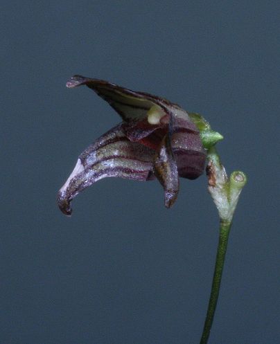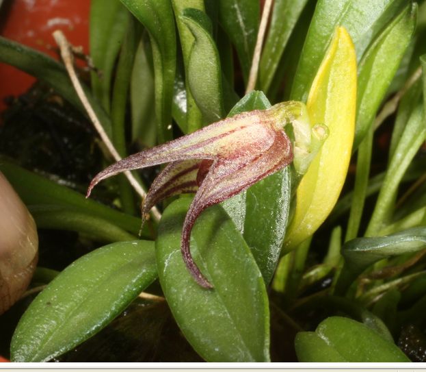 Found in southern Ecuador at elevations around 2700 meters as a mini-miniature sized, cold growing epiphyte with slender, erect ramicauls enveloped by 2 to 3 loose, tubular sheaths and carrying a single, apical, erect, coriaceous, narrowly obovate, subacute to obtuse, narrowly cuneate below into the petiolate base leaf that blooms in the summer on a suberect, slender, congested, 2" [5 cm] long, slow succession of single, few flowered inflorescence arising from low on the ramicaul witha tubular floral bract.