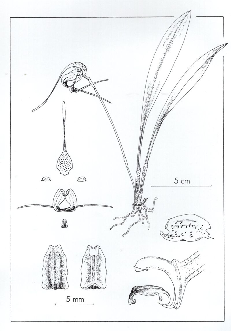 Found in Colombia in cloud forests at elevations of 1800 to 2600 meters as a miniature sized, cool to cold growing, epiphytic species discovered in 1976 and is from with slender, erect ramicauls enveloped basally by 2 to 3 tubular sheaths carrying a single, apical, erect, coriaceous, elliptical, acute to subacute leaf that gradually narrows below into the petiole and blooms in the fall on a slender, suberect, 3 1/5" to 4 2/5" [8 to 11 cm] long, single flowered inflorescence arising from low on the ramicaul with a bract below the middle and a tubular floral bract that has a solitary flower nestled amidst the leaves.