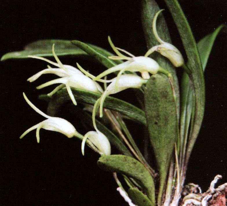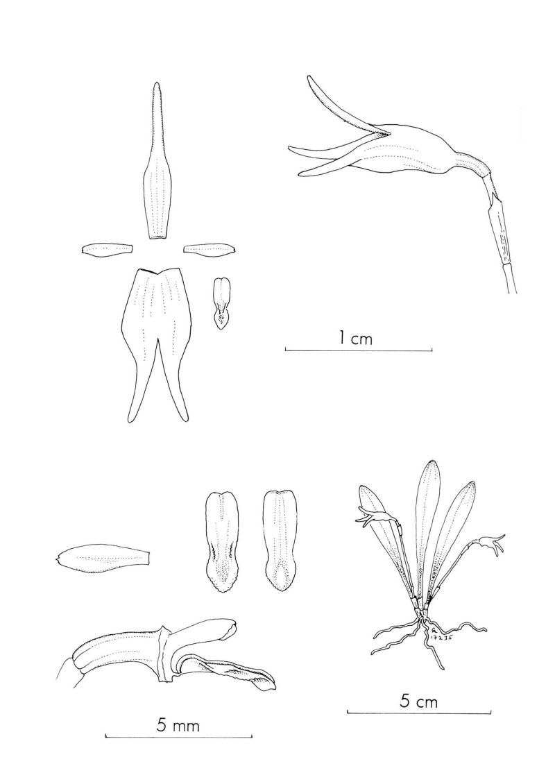 Found in Chiapas state of Mexico, Guatemala and Belize in moist evergreen forests at elevations around 1000 meters as a mini-miniature sized, warm to cool growing epiphyte with erect, slender ramicauls enveloped by 2 to 3, thin, tubular sheaths and carrying a single, apical, erect, coriaceous, narrowly obovate, subacute, gradually narrowing below into the indistinct petiolate base leaf that blooms in the later fall and winter on a slender, erect, .8 to 1" [2 to 2.5 cm] long, single flowered inflorescence arising from low on the ramicaul with a bract above the base.