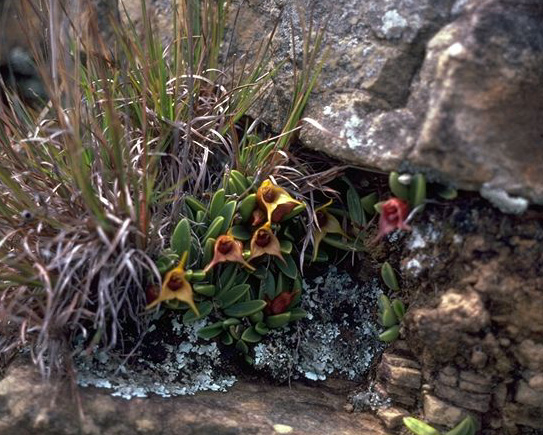 Found in Peru in xerophytic conditions in bare rocky terrain in full sun at elevations of 2500 to 3800 meters as a mini-miniature sized, cold growing terrestrial or lithophyte with erect, stout, terete ramicauls enveloped basally by 2 to 3 short, imbricating, tubular sheaths and carrying a single, apical, erect, coriaceous, semiterete, grey-green, fleshy, sulcate, narrowly linear elliptical obovate, acute, greadually narrowing into the base leaf that blooms in the spring and summer on a stout, suberect, .4 to .6" [1 to 1.5 cm] long, single flowered inflorescence arising from low on the ramicaul with a bract above the base.