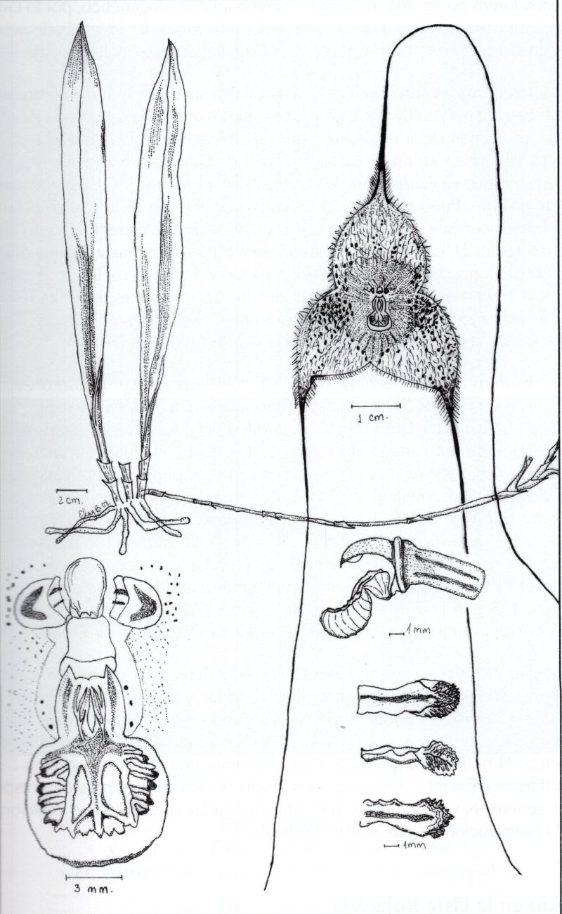 Found on the western cordillera of Colombia in cloud forests at elevations around 1800 to 2200 meters as a small sized, cool to cold growing epiphyte with an erect ramicaul enveloped by 2 to 3 sheaths and carrying a single, apical, erect, thinly coriaceous, carinate, linear, acute, gradually contracted below into the subpetiolate base leaf that blooms in the summer on a horizontal to descending, slender, brown, 6.4 to 8.4" [16 to 21 cm] long, successively single, few flowered inflorescence arising from low on the ramicaul a few tubular bracts.
