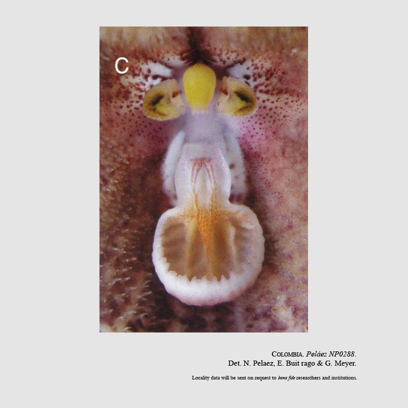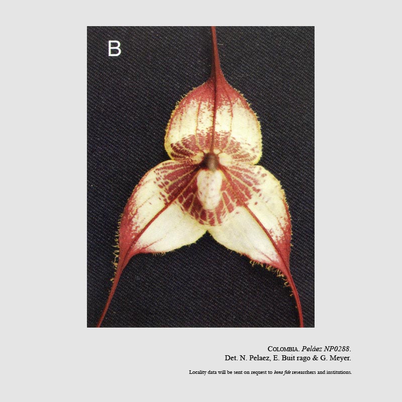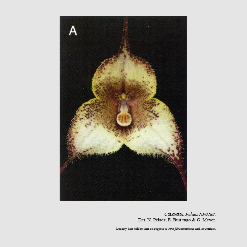 References W3 Tropicos, Kew Monocot list , IPNI ; *Orquideologia Vol 26 # 1 pg 30. N.Peláez, Buitr.-Delg. & Gary Mey. 2009 drawing/photo fide; Orchids Masdevallia with its segregates including Dracula Zelenko 2014 photo fide; Orchids of the Department of Valle de Cauca Colombia Vol 4 Kolanowska, Szlachetko 2016