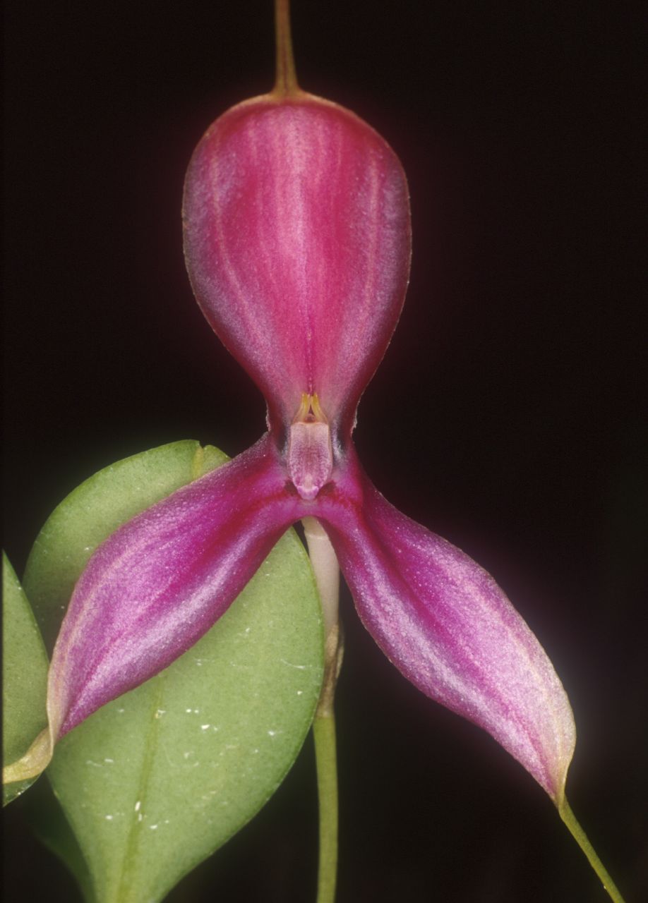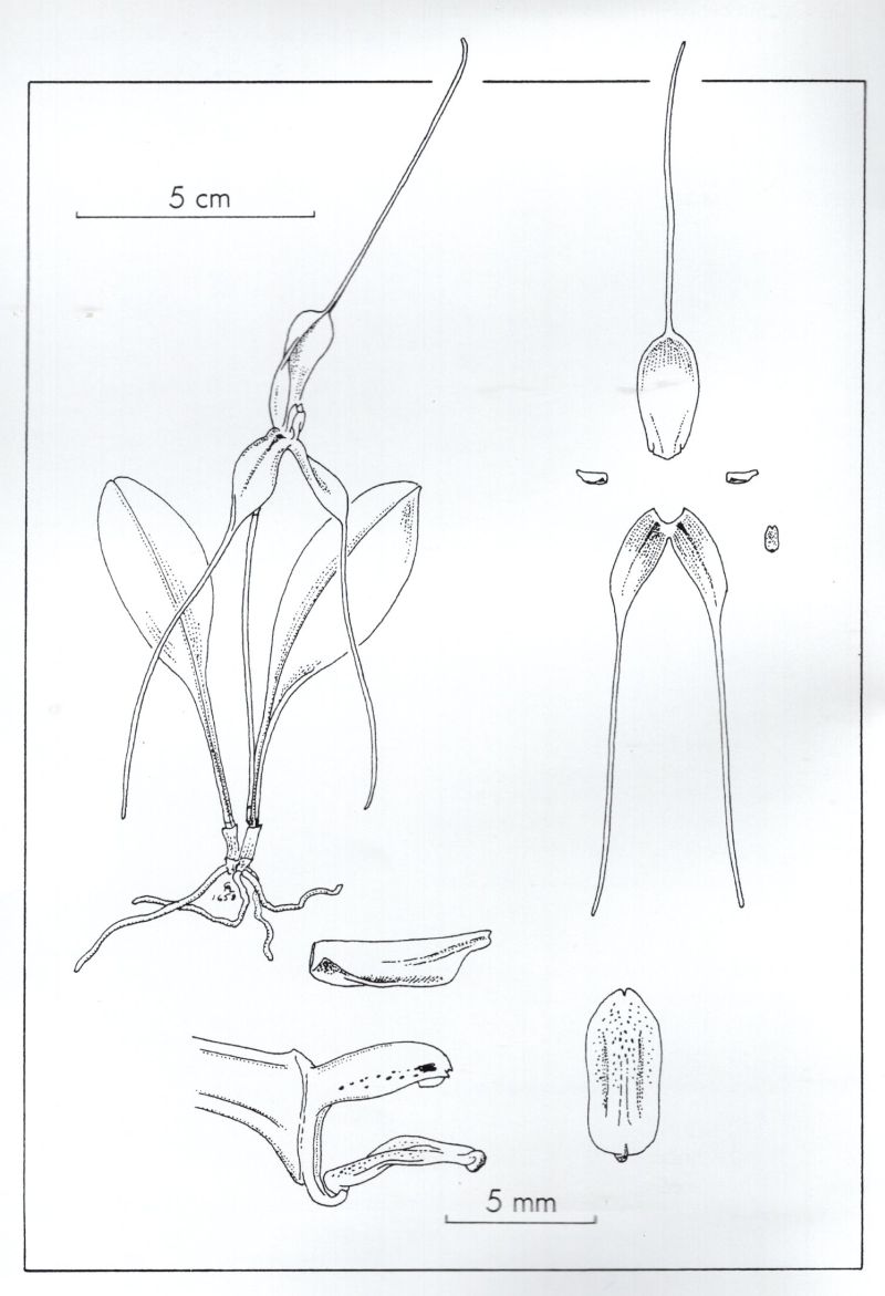 Found in Peru, Ecuador and Colombia from the cloud forests and wet montane forests of the Andes at 1400 to 2400 meters as a mini-miniature sized, caespitose, cool to cold growing, epiphyte with short, inconspicuous, channeled, black ramicauls enveloped basally by 2 to 3 loose tubular sheaths with a single, apical, elliptic, erect, coriaceous, attenuate to the channeled black petiole, mid-vein carinate, coriaceous leaf with a slightly tridenticulate apex that blooms in the summer and early fall on a large solitary flower on a, slender, 4" [10cm] long, erect inflorescence arising from low on the ramicaul with a bract near the base and a tubular floral bract holding the single flower way above the leaves.