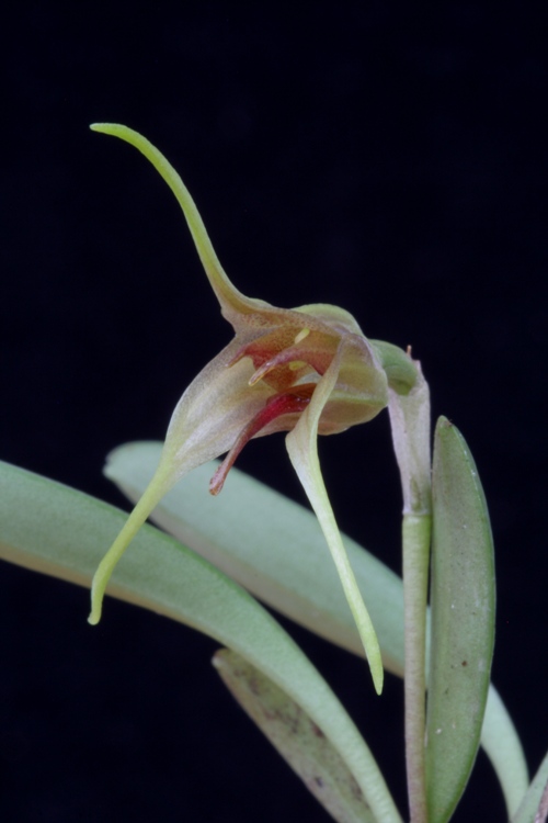 Found in southern Costa Rica and Chiriqui province of Panama at elevations around 1300 to 2500 meters as a mini-miniature sized, cold growing epiphyte with erect, slender ramicauls enveloped basally by 2 to 3 thin, close, tubular sheaths and carrying a single, apical, erect, coriaceous, narrowly obovate, obtuse,gradually narrowing below into the indistinct petiolate base leaf that blooms in the winter on an erect, 2 to 2.4" [5 to 6 cm] long, single flowered inflorescence with a bract near the base, arising from low on the ramicaul and has a tubular floral bract and holding the flower at leaf height.