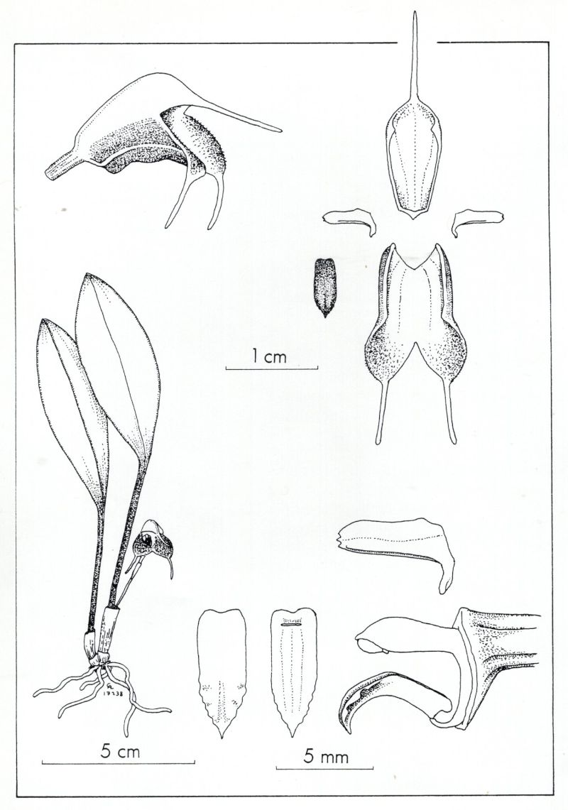 Found in Bolivia in wet forests at elevations around 2300 meters as a miniature sized, cold growing terrestrial with erect, slender ramicauls enveloped basally by 2 to 3 loose, tubular sheaths and carrying a single, apical, erect, coriaceous, narrowly elliptical, acute, narrowly cuneate below into the petiolate base leaf that blooms in the summer on a slender, erect, 2 to 2.4" [5 to 6 cm] long, single flowered inflorescence arising from low on the ramicaul with a bract below the base and a tubular floral bract holding the flowerbeneath the leaves.