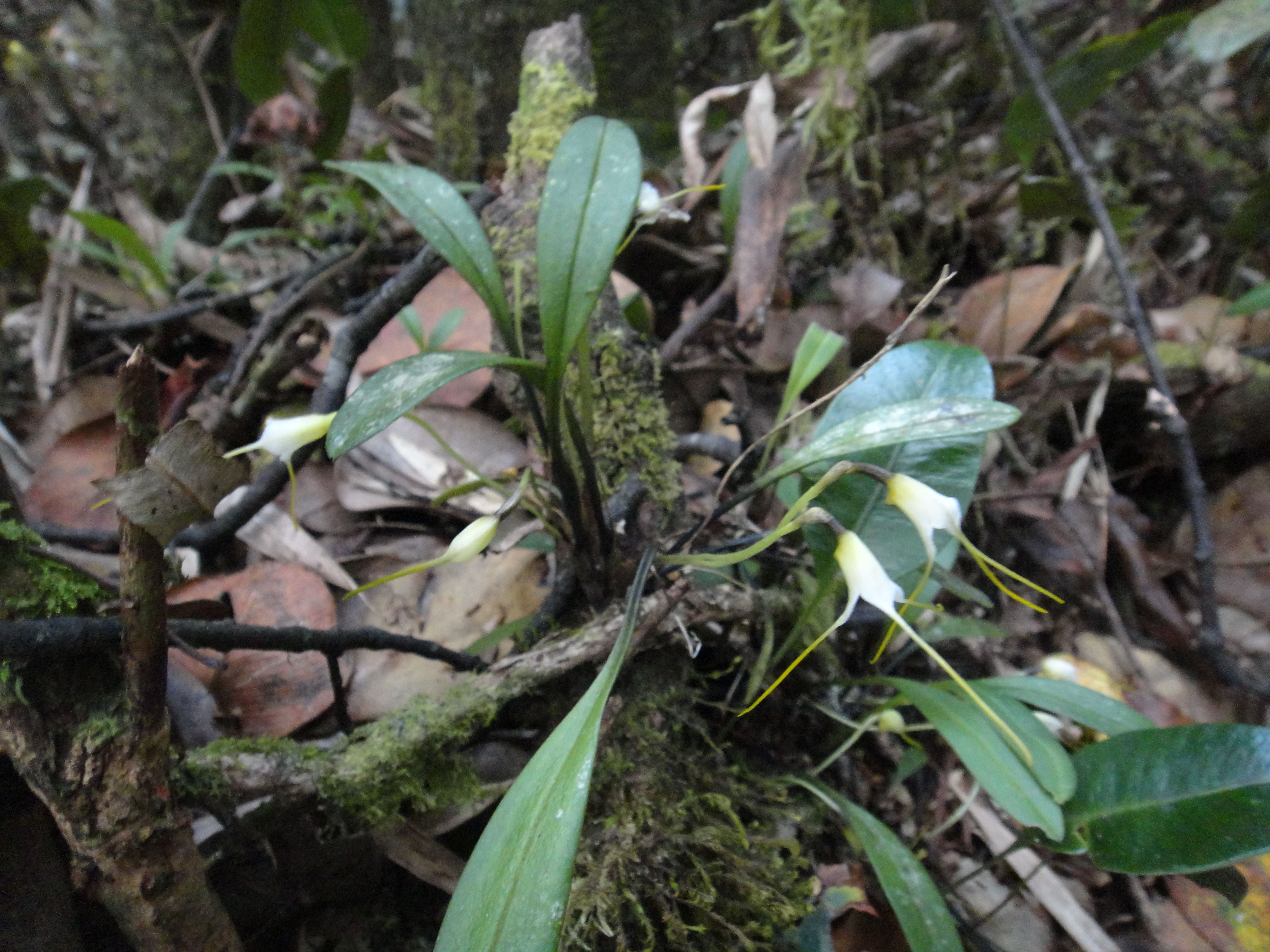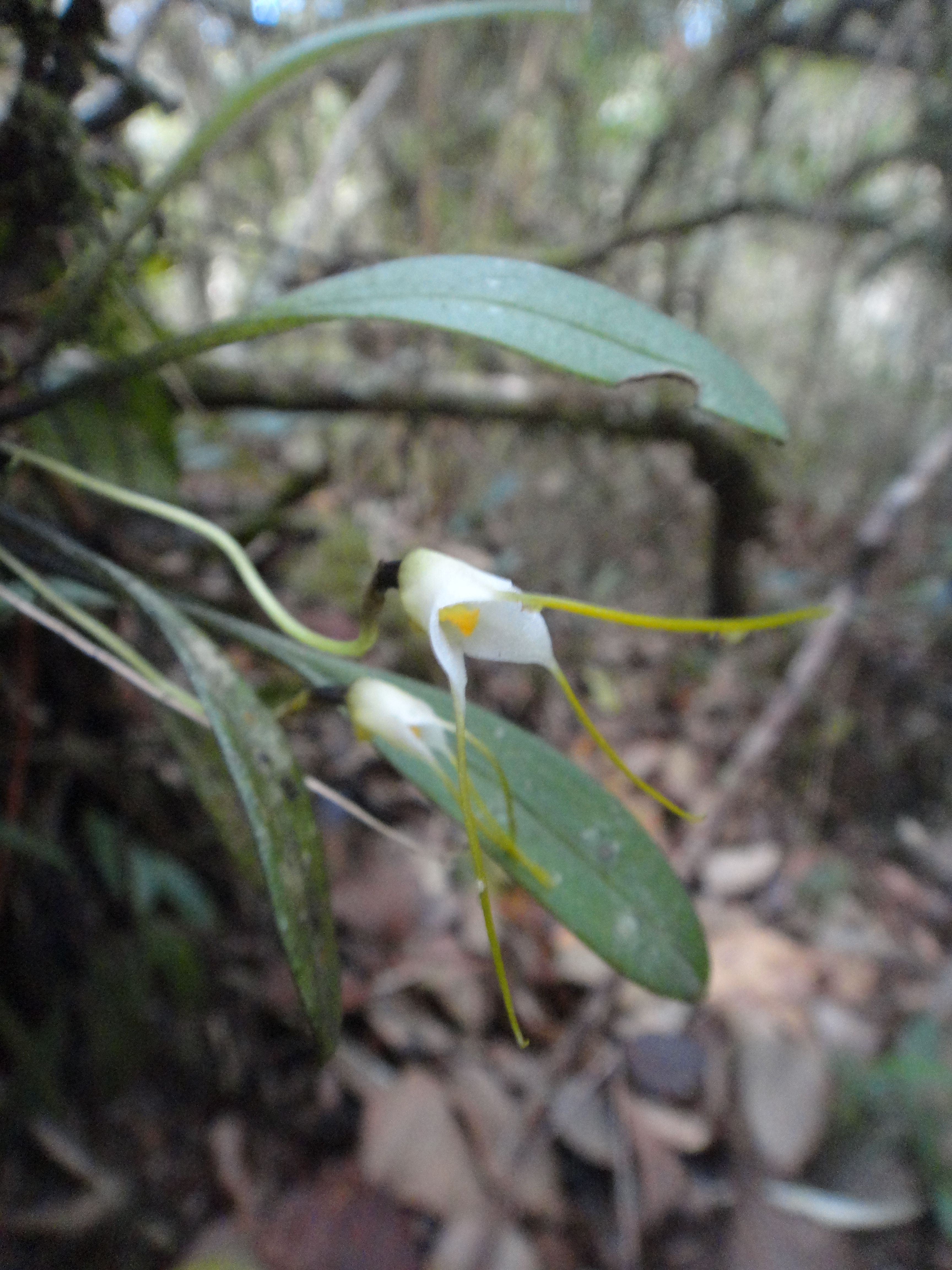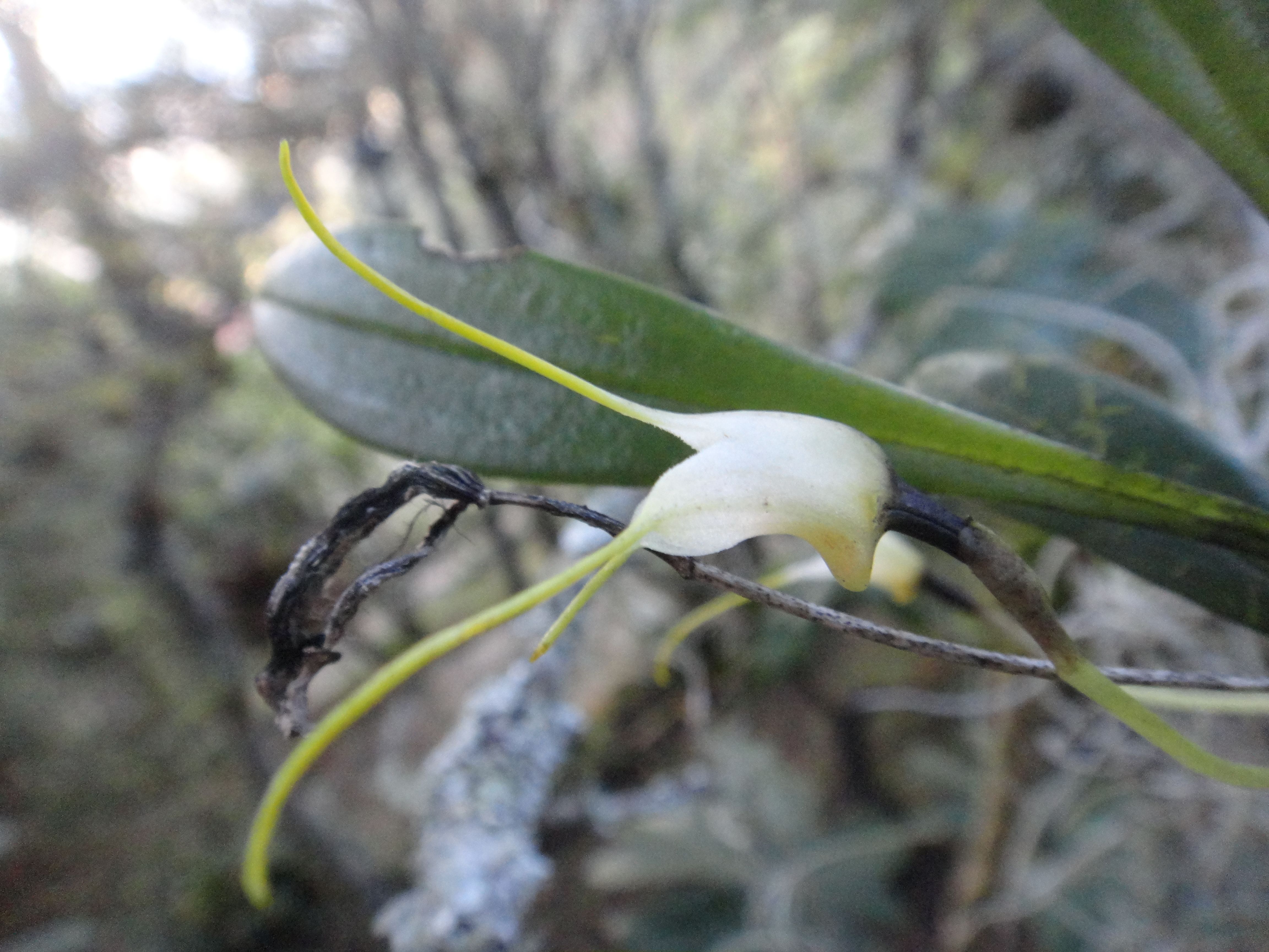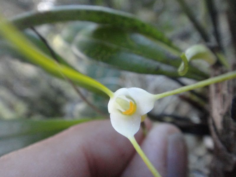 Found in Venezuela, Colombia and Ecuador in cloud forests to dwarf forests at elevations around 2000 to 3750 meters as a miniature sized, cold growing epiphyte or terrestrial with blackish, erect, coriaceous ramicauls enveloped basally by 2 to 3 tubular sheaths and carrying a single, apical, dark green mottled with black, coriaceous, petiolate, narrowly elliptical leaf that gradually narrows below into the slender blackish petiole and blooms in the spring on a slender, erect, 1 to 4.2" [2.5 to 11 cm] long, single flowered inflorescence arising from low on the ramicaul and having a bract above the base and tubular floral bracts and holding the flower above the middle of the leaf height