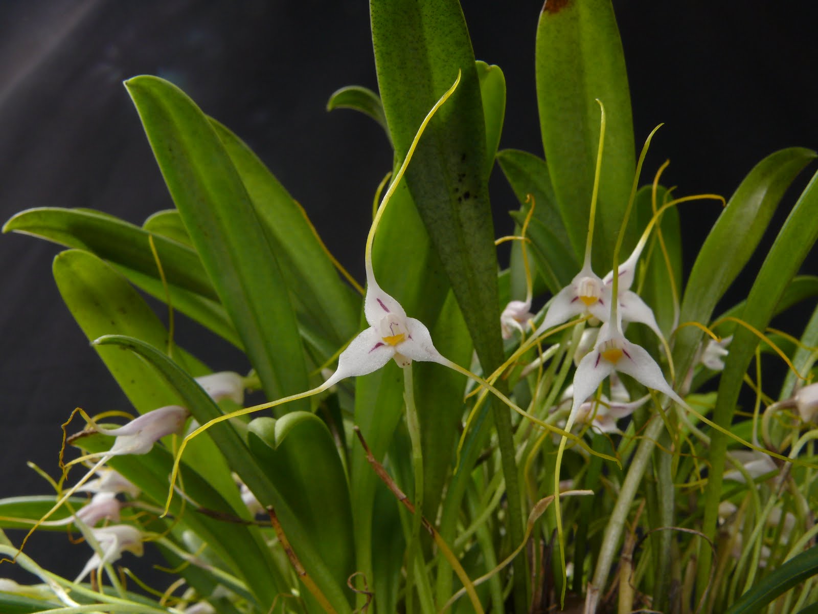 Found in Valle de Cauca department of Colombia in cloud forests at elevations around 3000 to 3200 meters as a mini-miniature sized, cold growing epiphyte with blackish, slender, erect ramicauls enveloped by 2 loose, tubular sheaths and carrying a single, apical, erect, coriaceous, narrowly elliptical, subacute to acute, gradually narrowing below into the petiolate base leaf that blooms in the later winter and early spring on a slender, erect, 2.4 to 3.2" [6 to 8 cm] long, single flowered inflorescence arising from low on the ramicaul with a bract at the base and a tubular floral bract and holding the flowers at mid leaf height.