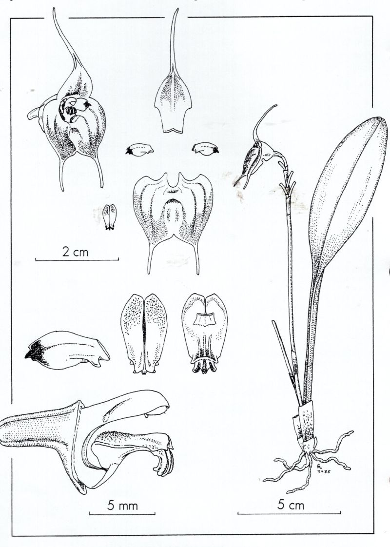 Found in Colombia, Ecuador and Peru in cloud forests at elevations of 1500 to 2450 meters as a miniature to small sized, cool to cold growing epiphyte with blackish, erect, slender ramicauls enveloped basally by 2 to 3 loose, tubular sheaths and carrying a single, apical, erect, coriaceous, dark green, elliptical-ovate, subacute to obtuse, cuneate below in to the slender, blackish, petiolate base leaf that blooms in the spring and fall on an erect, slender, terete, 4.8 to 8.4" [12 to 21 cm] long, congested, successively several flowered inflorescence arising from above the base of the ramicaul with a bract above the base and loose, tubular floral bracts.