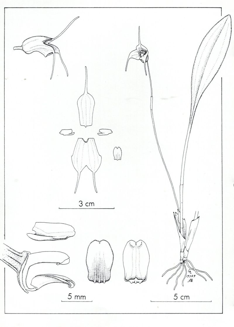 Found in southern Peru without locality as a small sized epiphyte with slender, erect ramicauls enveloped basally by 2 to 3, loose, tubular sheaths and carrying a single, apical, erect, coriaceous, narrowly elliptical, acute, narrowly cuneate below into the petiolate base leaf that blooms in the summer on a erect, slender, 2.4 to 2.6" [6 to 6.5 cm] cm] long, single flowered inflorescence arising from low on the ramicaul, with a bract near the base and a tubular floral bract.