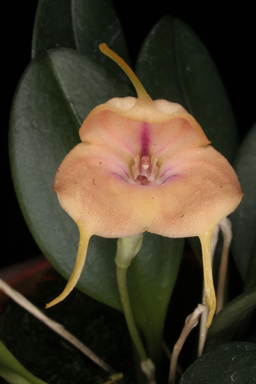 Found in Ecuador and Peru at elevations around 2000 meters as a mini-miniature sized, cool to cold growing epiphyte with slender, erect, blackish ramicauls enveloped basally by 2 to 3 tubular sheaths and carrying a single, apical, erect, coriaceous, elliptical, obtuse, cuneate below into the petiolate base leaf that blooms in the spring on a slender, subhorizontal to ascending, 1.6" [4 cm] long, single flowered inflorescence arising from low on the ramicaul with a bract at the base and a floral bract.