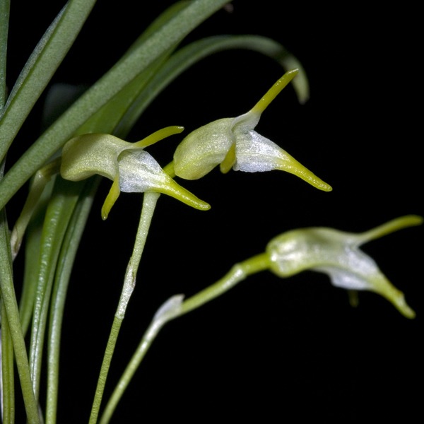 Found in Putumayo department of Colombia and Ecuador in cloud forests at elevations around 1000 to 1700 meters as a mini-miniature sized, cool growing epiphyte with slender, blackish, erect ramicauls enveloped basally by 2 to 3 tubular sheaths and carrying a single, apical, erect, coriaceous, narrowly obovate, obtuse, gradually narrowing below into the petiolate base leaf that blooms in the winter and spring, on an erect, slender, 1 to 1.2" [2.5 to 3 cm] long, single flowered inflorescence arising from low on the ramicaul, with a bract near the base.