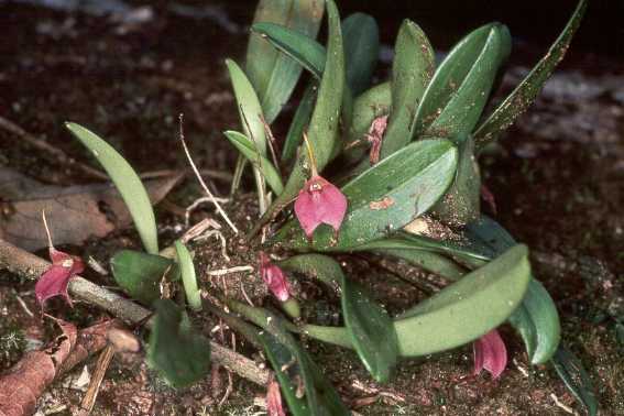 Found in Chiapas state of Mexico and Guatemala in damp forests at elevations of 400 to 1500 meters as a mini-miniature to small sized, hot to cool growing, tufted, epiphyte with erect, slender ramicauls enveloped basally by 2 to 3 close, thin tubular sheaths carrying a single, apical, oblong-lanceolate, petiolate leaf and blooms in the late spring, summer and early fall with a 3 to 5" [7.5 to 13 cm] long, slender, decumbent to erect inflorescence arising from low on the ramicaul holding the single flower [often followed by a second] just above leaf height.