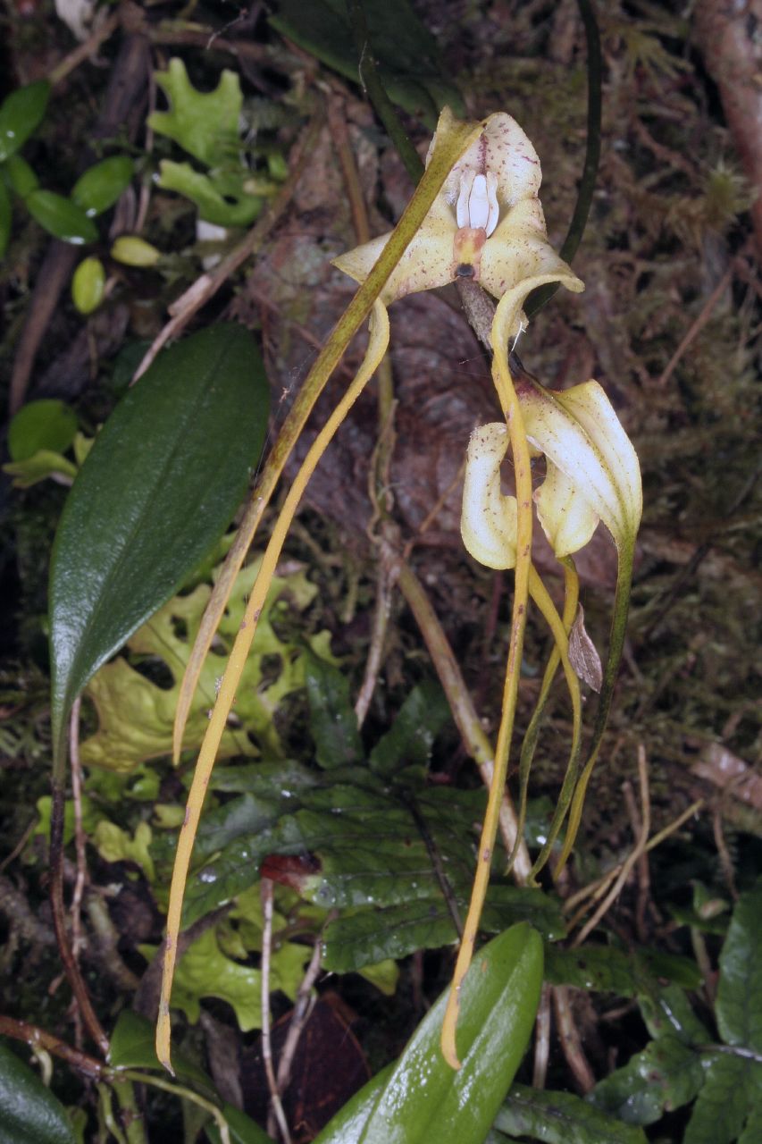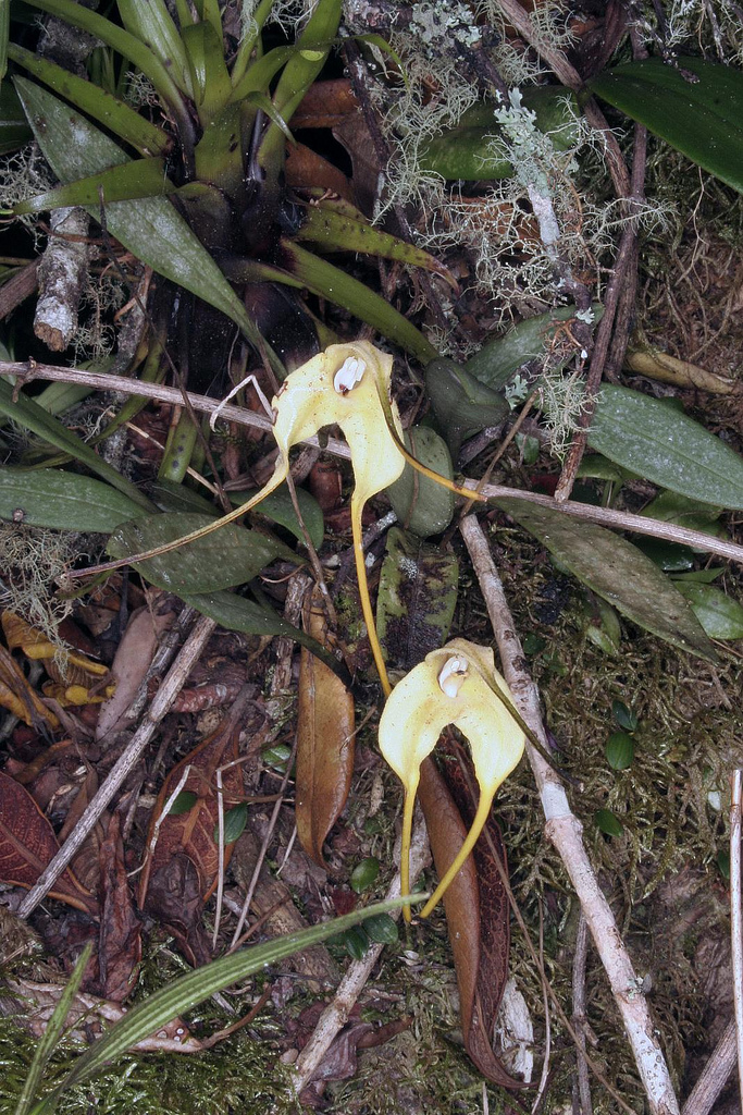 Found in southern Colombia and northen Ecuador in cold wet cloud forests at elevations of 3000 to 4000 meters as a miniature sized, cold growing epiphyte with erect, slender, often blackish ramicauls enveloped by 2 to 3 loose, tubular sheaths and carrying a single, apical, erect, coriaceous, narrowly elliptical, subacute, gradually narrowing below into the petiolate base leaf that blooms in the late winter and spring on a slender, erect, 3.6 to 6.4" [9 to 16 cm] long, single flowered inflorescence arising from low on the ramicaul.
