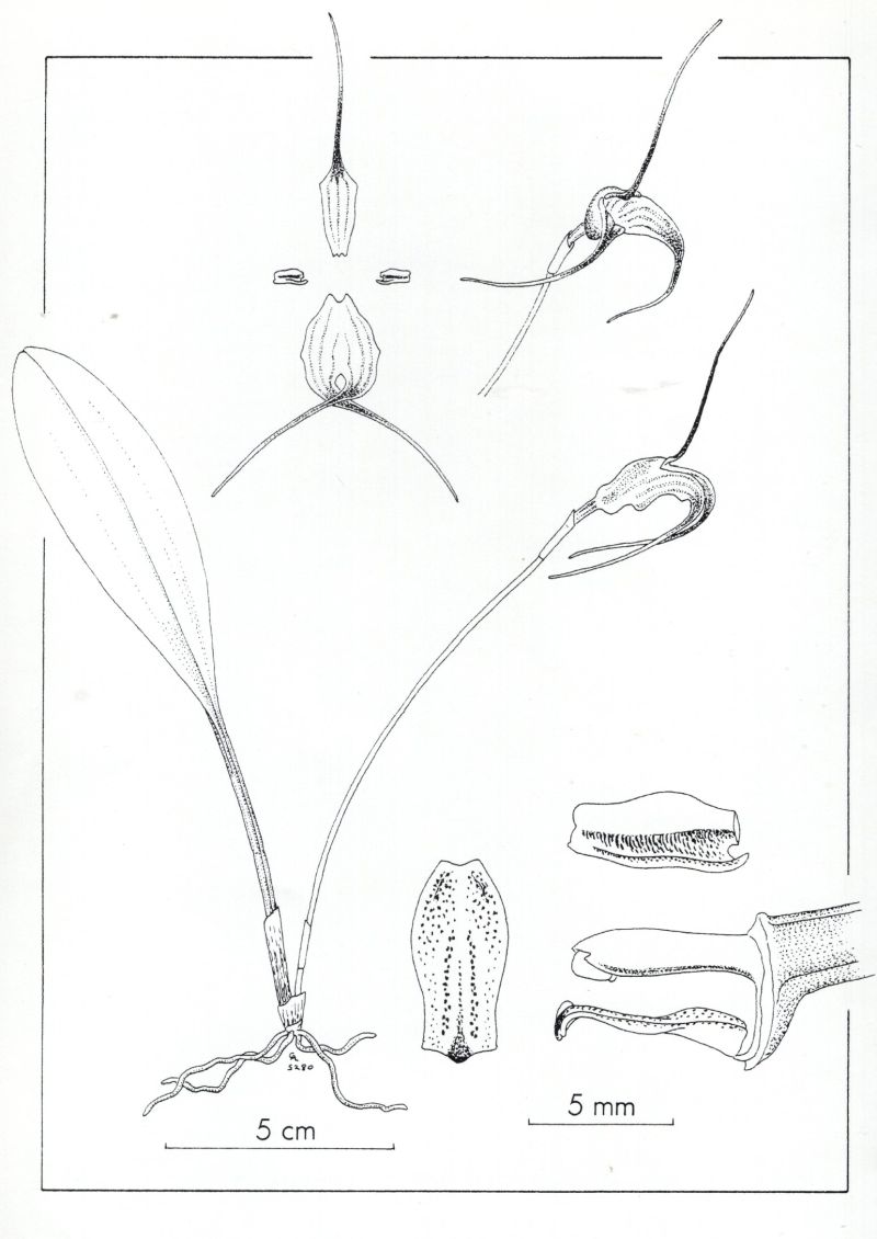 Found in Colombia, Ecuador and Peru in cloud forests at elevations of 1400 to 3100 meters as a miniature sized, cool to cold growing epiphyte with erect, slender ramicauls enveloped basally by 2 to 3 loose, tubular sheaths carrying a single, apical, erect, coriaceous,elliptical, subacute to obtuse leaf that is cuneate into the long petiole below and blooms in the spring on a slender, erect, 2 3/4" to 6" [7 to 15 cm] long, single flowered inflorescence arising from low on the ramicaul.
