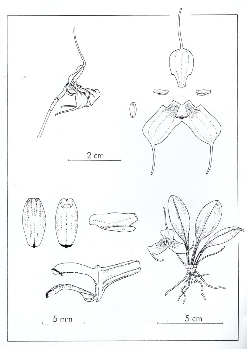 Found in southern Ecuador and northern Peru at elevations of 2200 to 2400 meters as a mini-miniature sized, cold growing epiphyte that is with a blackish, slender, erect ramicaul enveloped basally by 2 loose tubular sheaths carrying a single, apical, erect, coriaceous, elliptical, obtuse leaf that is cuneate into the blackish petiole and blooms on a basal, .8 to 1" [2 to 2.5 cm] long, suberect, single flowered inflorescence arising from low on the ramicaul with a bract near the base and a thin tubular floral bract holding the flower below the leaves occuring in the winter.