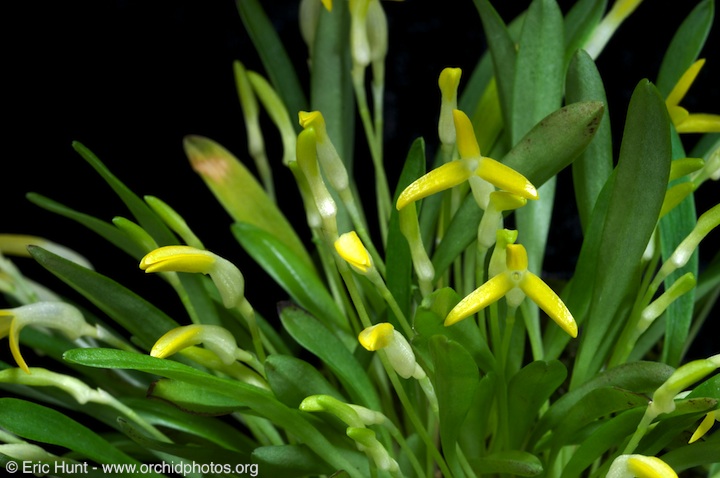 Found in Venezuela in the coastal mountains west of Caracas in cloud forests at elevations of 760 to 1700 meters as a mini-miniature sized, warm to cool growing epiphyte with erect, slender ramicauls enveloped by 2 to 3, close, thin tubular shaths and carrying a single, apical, erect, coriaceous, narrowly obovate, subacute, gradually narrowing below into the indistinct petiolate base leaf that blooms in the spring on an erect to suberect, slender, 1.2 to 4" [3 to 10 cm] long, single flowered inflroescence arisinfg from low on the ramicaul with a bract above the base and a tubular floral bract.