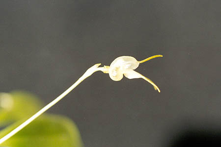 Found in central Ecuador on the western slopes of the Andes at elevations around 1450 to 2000 meters as a mini-miniature sized, cool growing epiphyte with slender, erect to suberect ramicauls enveloped basally by 2 to 3 tubular sheaths and carrying a single, apical, erect, coriaceous, elliptical, obtuse to subacute, cuneate below into the slender petiolate base leaf that blooms in the spring and fall on a suberect, slender, 2.8 to 3.6" [7 to 9 cm] long, single flowered inflorescence arising from low on the ramicaul, with a bract above the base.