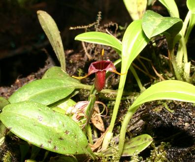 Found in Colombia and Ecuador in cloud forests on tree trunks close to the ground at elevations of 1700 to 2500 meters as a mini-miniature sized, cool to cold growing epiphyte with slender erect ramicauls enveloped basally by 2 to 3 loose tubular sheaths carrying a single, apical, oblong-lanceolate, petiolate, sub-erect to spreading, coriaceous leaf gradually narrowing below into the petiole that blooms in spring and early summer on a terete, slender, erect to suberect, to 4" [10cm] long inflorescence arising from low on the ramicaul with a bract above the base and a membraneous, apiculate floral bract bract that is holds the solitary, tubular flower among the leaves. Either potted or mounted suit this species if it is given cold to cool temperatures, constant moisture, high humidity and heavy shade.