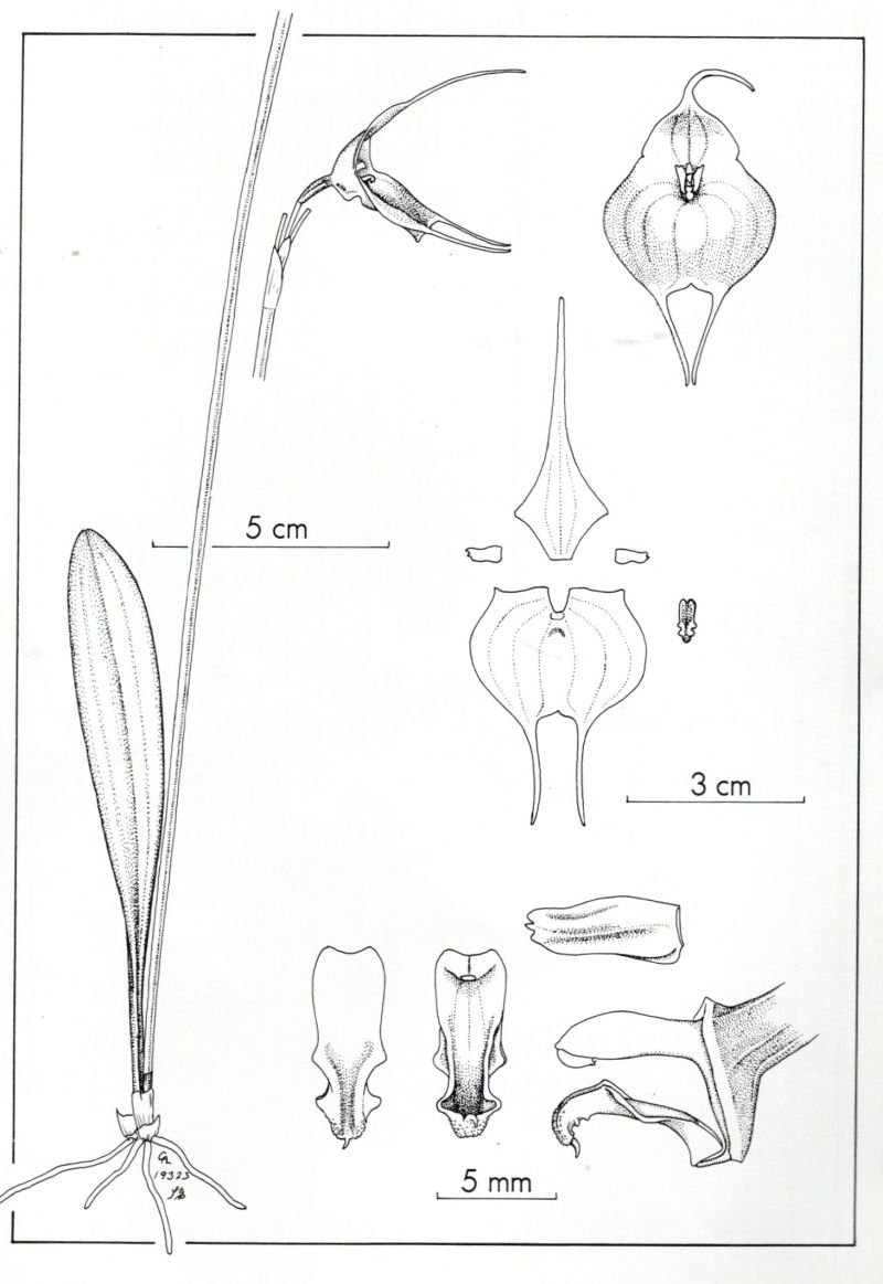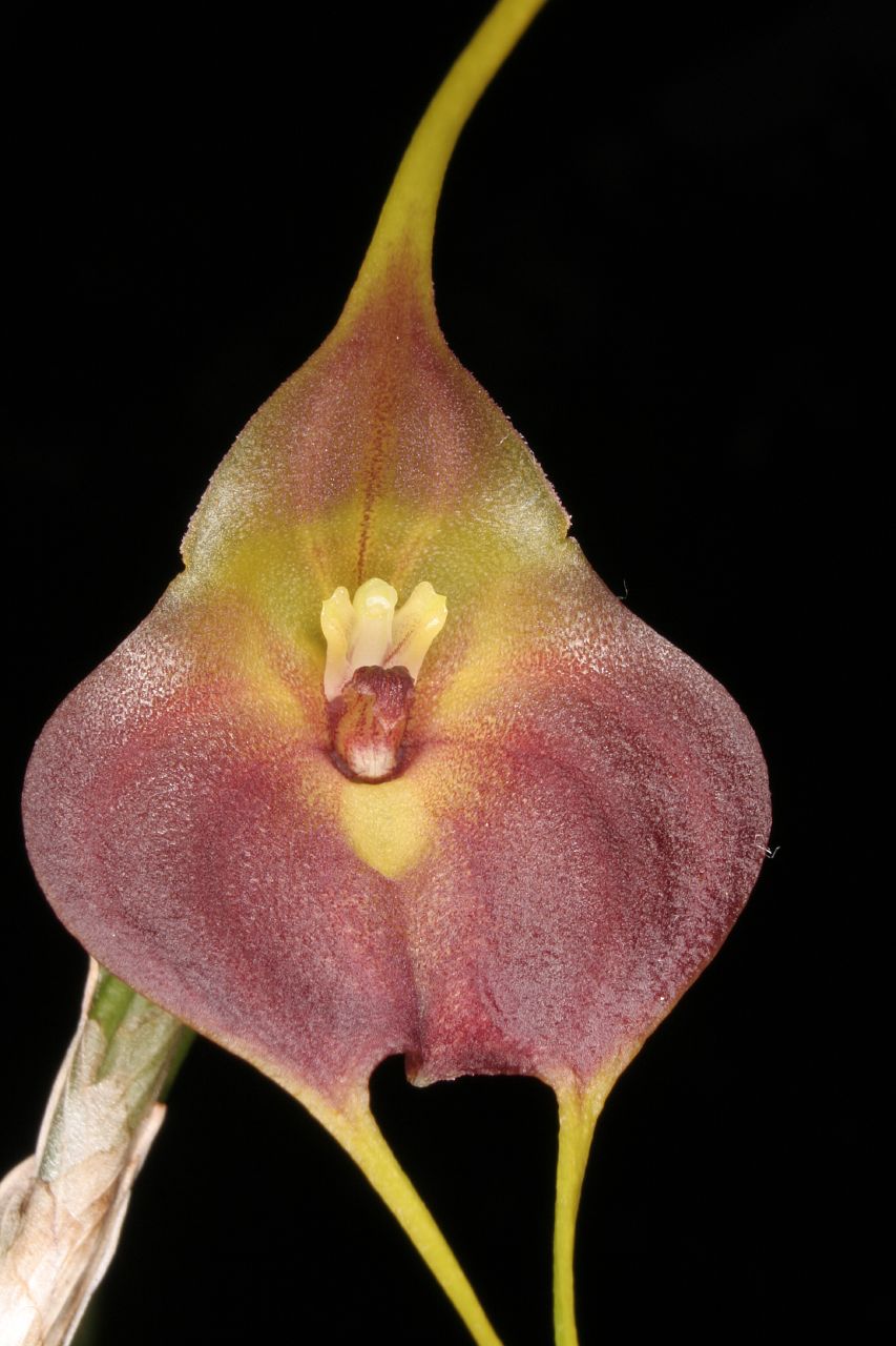 Found in southeastern Ecuador at elevations around 600 meters as a mini-miniature sized, Warm growing epiphyte with stout, erect ramicauls enveloped basally by a loose, tubular sheatha and carrying a single, apical, erect, coriaceous, narrowly elliptic, subacute, narrowly cuneate below into the indistinct, petiolate base leaf that blooms in the spring on a stout, erect, to 10.4" [26 cm] long, congested, racemose, successively single flowered inflorescence arising from the base of the ramicaul with a basal tubular bract and thin, imbricating floral bracts.