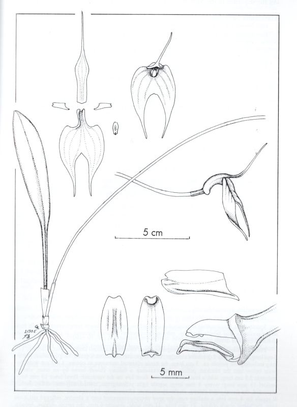 Found in northern Peru at elevations of 2400 to 2500 meters as a miniature sized, cold growing epiphyte with erect, short, ramicauls enveloped basally by a short sheath and carrying a single, apical, erect, coriaceous, elliptical-oblong, obtuse, appaently 3 veined, petiolate base leaf that blooms in the fall on a slender, erect, 5.2 to 10" [13 to 25 cm] long, single flowered inflorescence with tight floral bract and carrying the large crimson flower well above the leaves.