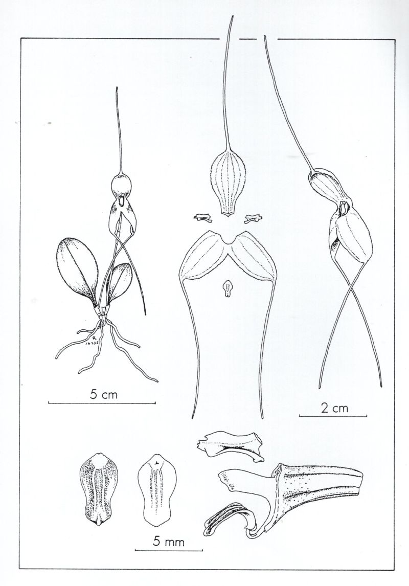 Found in northern Peru without locational data as a mini-miniature sized epiphyte with slender, erect, black ramcauls enveloped by 2 to 3, tubular sheaths and carrying a single, apical, erect, coriaceous, dark green, broadly elliptical, obtuse to rounded, cuneate below into the blackish petiolate base leaf that blooms in the fall on a slender, erect, 1.2 to 1.6" [3 to 4 cm] long, single flowered inflorescence arising from low on the ramicaul with a bract near the base and with a tubular floral bract.