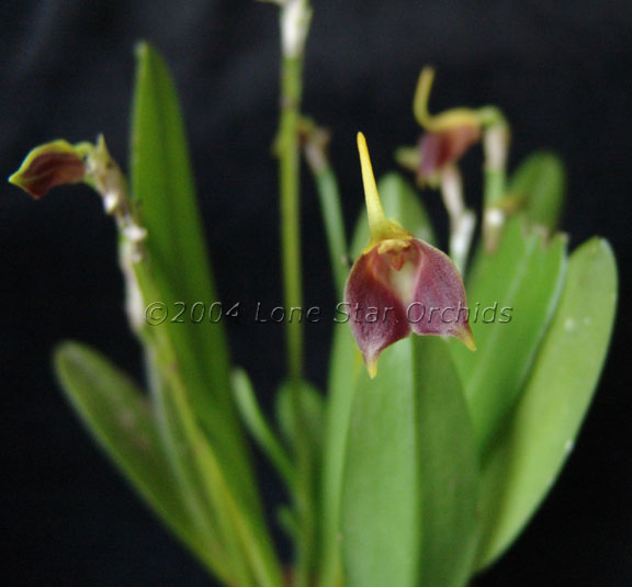 Found in Ecuador and Peru in montane rainforests at elevations of 800 to 1100 meters as a miniature sized, caespitose, warm to cool growing epiphyte with a short, erect, stout ramicaul concealed by 2 to 3 scarious, tubular sheaths with an erect, single, apical, oblanceolate, attenuate, obtuse, coriaceous, carinate leaf that blooms most often in the winter and spring on an erect, to 7" [to 18 cm] long, triangular in cross-section, inflorescence arising from the base of the ramicaul with a basal bract and tubular, imbricating floral bracts holding the flower well above or at the leaf height with several flowers opening in succession.