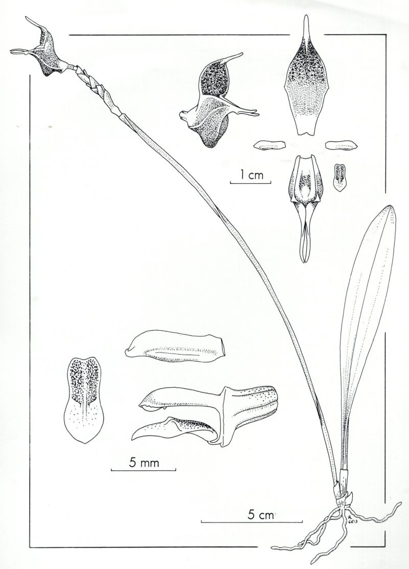 Found in Ecuador and Peru in damp forests at elevations of 1500 to 2250 meters as a small sized, cool to cold growing caespitose epiphyte with erect, stout, ramicauls enveloped by 2 to 3 loose, tubular sheaths carrying a single, apical, erect, thickly coriaceous, narrowly elliptical-obovate leaf that gradually narrows into an indistinct, channeled petiole that blooms at most any time of the year on an erect, 9 3/5" to 15 1/5" [24 to 36 cm] long, successively opening, several flowered, triquetrous inflorescence arising from near the base of the ramicaul with white, imbricating floral bracts and one flower appearing at a time held well above the leaf.