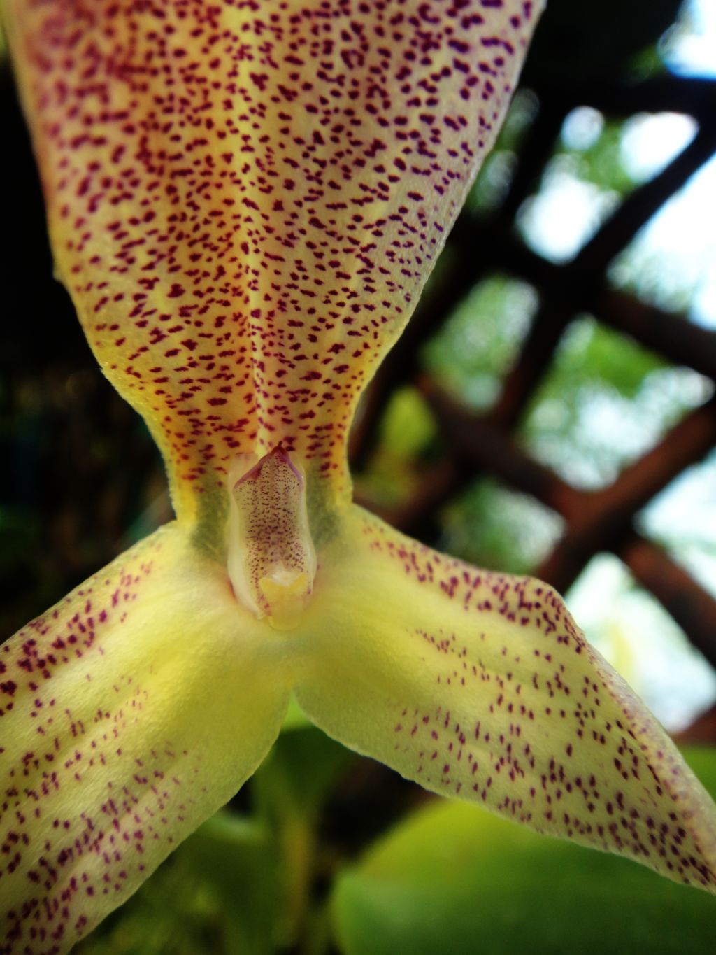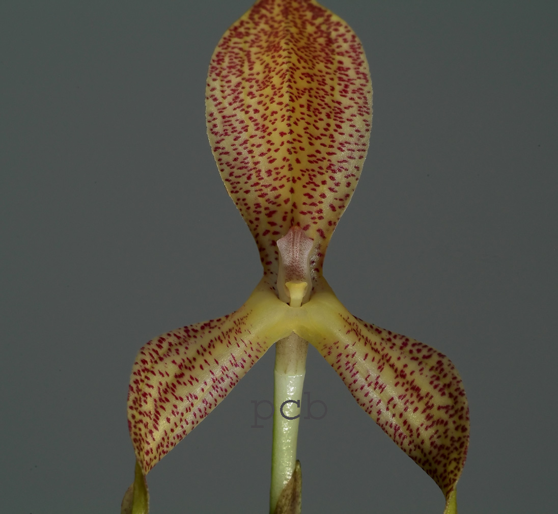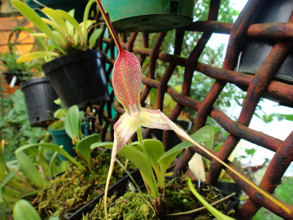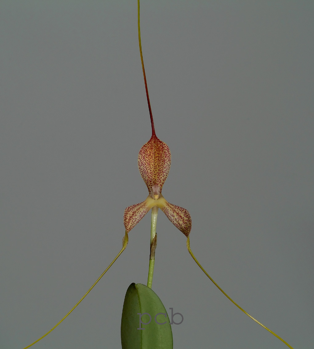 Found in northern Peru in montane, high rainforests at elevations of 2200 to 2400 meters as a miniature sized, cold growing epiphyte of semiarid regions and plants typically have blackish, erect, slender ramicauls enveloped basally by 2 to 3 close, tubular sheaths carrying a single, apical, erect, coriaceous, elliptical obtuse leaf that is cuneate below into the slender petiole that blooms in the spring through fall on a slender, erect, 3 3/5" to 6 3/5" [9 to 17 cm] long, single flowered inflorescence arising from low on ramicaul with a bract below the middle and a tubular floral bract carrying the flower at leaf height. Should be grown rather drier than many Masdevallias. It differs from the rest by it's huge, widely spread flower that is light yellow green, and is suffused with purple dots, has long tails and is held at leaf height.