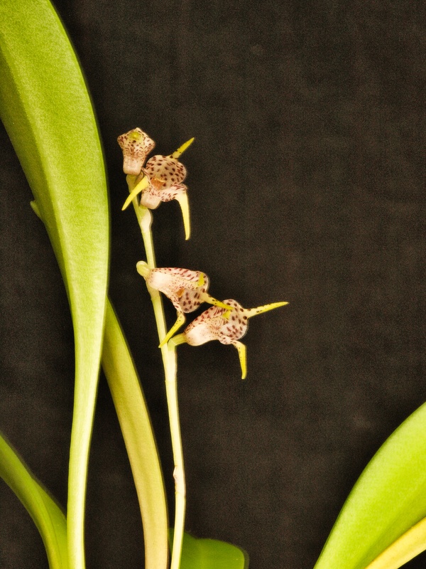 Found in Ecuador and northern Peru at elevations of 2200 to 2500 meters as a miniature sized, cold growing epiphyte with erect, slender, ramicauls enveloped basally by 2 to 3 tubular sheaths and carrying a single, apical, erect, coriaceous, narrowly elliptical-oblong, subacute, narrowly cuneate below into the petiolate base leaf that blooms in the fall, winter and spring on a slender, erect, 4 to 6.8" [10 to 17 cm] long, loose, secund to subsecund, simultaneously several flowered inflorescence with 1 to 2 distant bracts below the middle, from low on the ramicaul with thin tubular floral bracts and carrying the flowers beginning just at or just above leaf height.