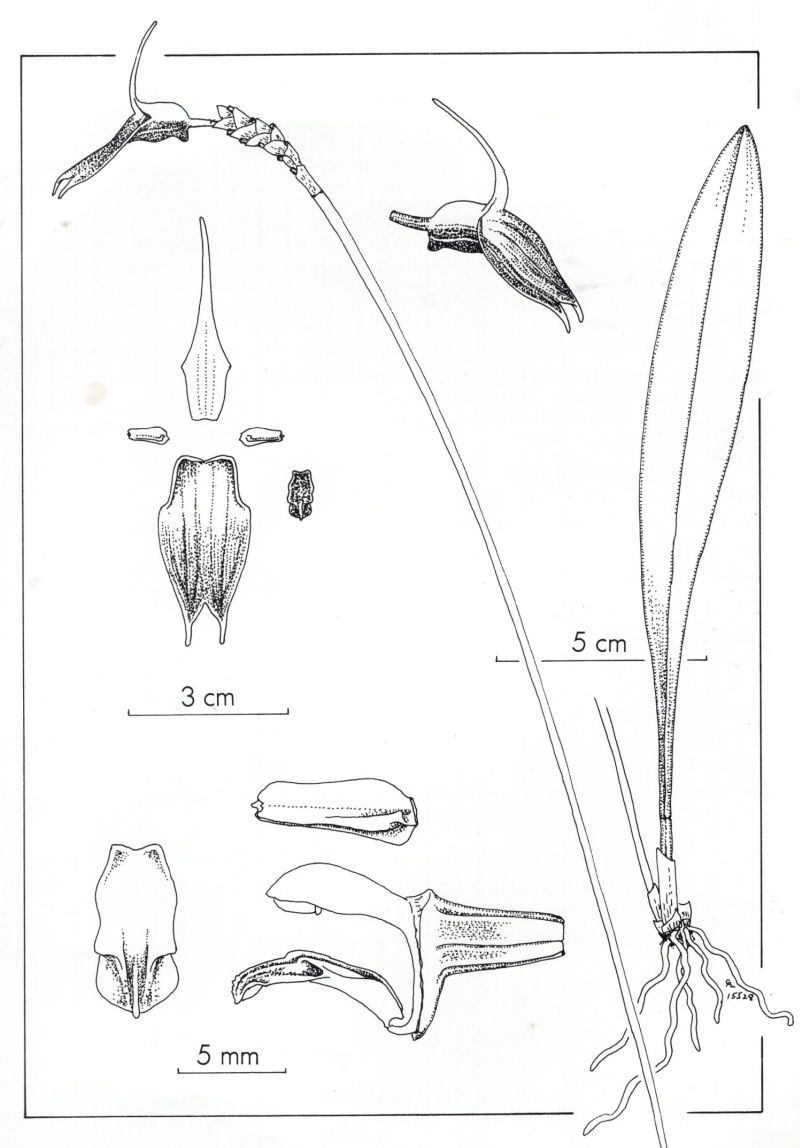 Found in Zamora-Chinchipe province of Ecuador in forests at elevations around 1800 meters as a miniature to just small sized, cool growing epiphyte with stout, erect, ramicauls enveloped by 2 to 3 tubular sheaths and carrying a single, apical, erect, coriaceous, elliptical, subacute, gradually narrowing below intothe petiolate base leaf that blooms in the fall on a stout, erect, triquetrous, 10 to 11.2" [25 to 28 cm] long, successively single, few flowered inflorescence arising from the base of the ramicaul, with a basal bract and whitish, tubular, imbricating floral bracts.
