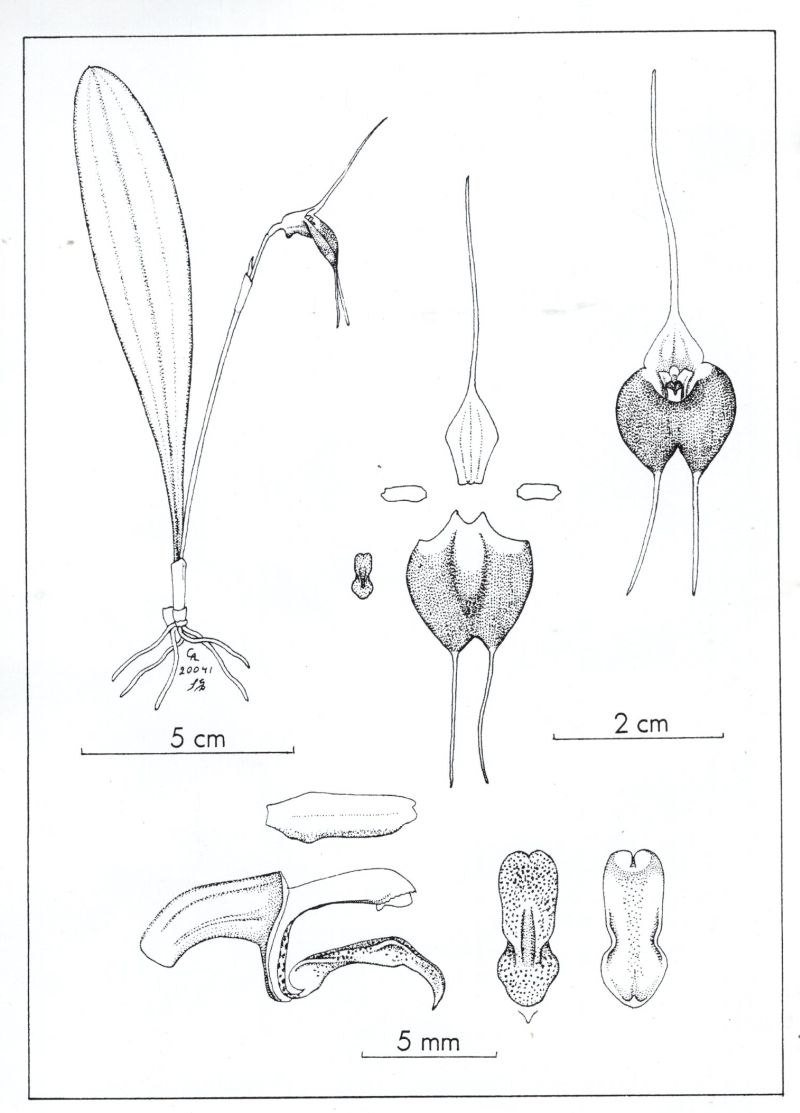 Found in Morona-Santiago province of Ecuador in forests at elevations around 1273 meters as a miniature sized, cool growing epiphyte with stout, erect, ramicauls enveloped by a loose, tubular sheaths and 1 to 2 others at the base and carrying a single, apical, erect, coriaceous, elliptical, obtuse, narrowing below into the petiolate base leaf that blooms in the fall on a terete, erect, 2.4" [6 cm] long, lax successively few flowered inflorescence arising from low on the ramicaul, with a close basal bract.