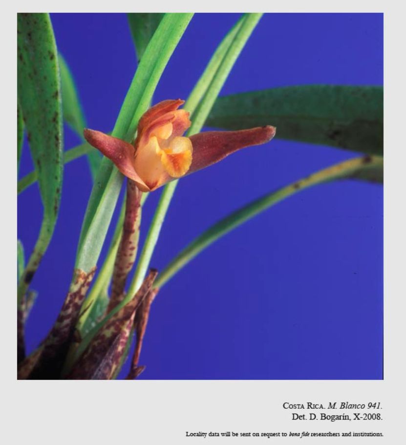 References W3 Tropicos, Kew Monocot list , IPNI ; Fieldiana Biology, Flora Costa Ricensis Family # 39 Orchidaceae, subtribes Maxillariinae and Oncidiinae Atwood & Mora 1999 drawing good; Manual de Plantas de Costa Rica Vol 3 Hammel, Grayum, Herrera and Zamora 2003; AOS Bulletin Vol 75 No 1 2006 photo fide; Vanishing Beauty, Native Costa Rican Orchids Vol 2 Lacaena to Pteroglossa Pupulin 2020 photo fide