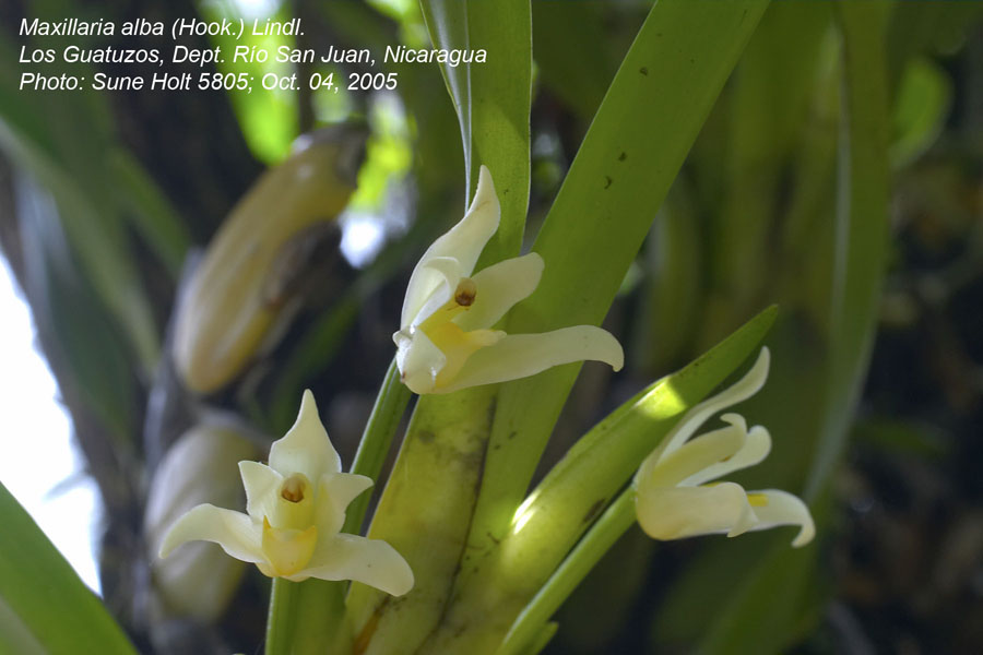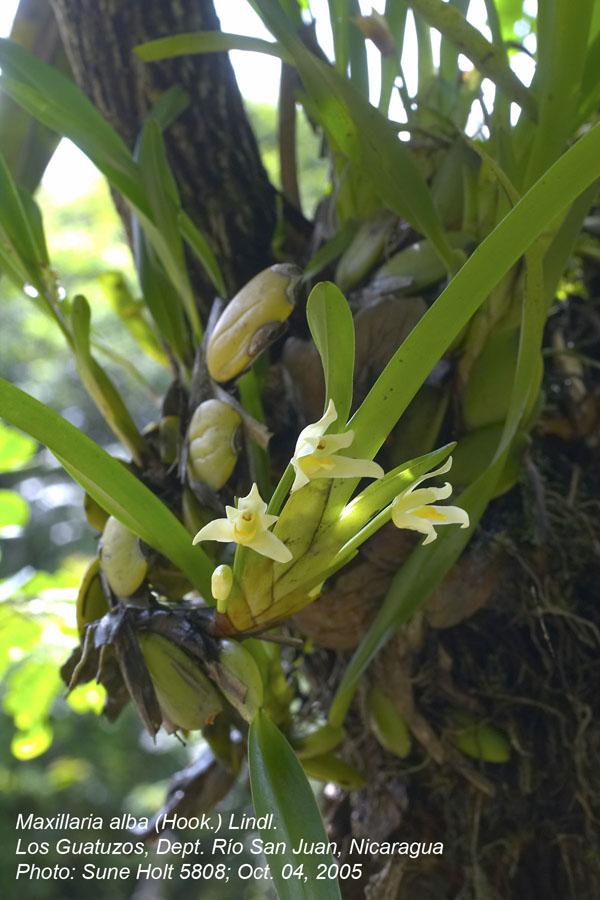 References W3 Tropicos, Kew Monocot list , IPNI Symbolae Antillanae Vol VI Orchidaceae Urban 1909; Flora of Jamaica Fawcett & Rendle 1910 drawing ok; The Orchids of Panama L.O. Williams & P Allen 1946; Flora Brasilica Vol XII VII 115-147 Hoehne 1953 as Camaridium alba drawing ok; AOS Bulletin Vol 27 No 6 1958; Native Orchids of Trinidad Schultes 1960; Venezuelan Orchids Vol 2 Dunsterville & Garay 1961 drawing fide; Encyclopedia of Cultivated Orchids Hawkes 1965; AOS Bulletin Vol 36 #9 1967; Flora de Venezuela Foldats Volumen XV Part 4 1970 drawing fide; Orchidaceae Brasilenses Band 2 Pabst & Dungs 1977 drawing fide; Orchids of Venezuela, An Illustrated Field Guide Vol 2 Dunsterville & Garay 1979 drawing fide; Icones Planetarum Tropicarum Pate 144 Dodson 1980 drawing fide; Icones Planetarum Tropicarum Pate 841 Hamer/Dodson 1983 drawing ok; The Orchids of Surinam Werkhoven 1986; Icones Planetarum Tropicarum Pate 1334 Dodson 1989 drawing ok; Rudolf Schlechter Die Orchideen Band 1B lieferung 28 1713 - 1776 Brieger 1993 ; AOS Bulletin Vol 63 No 3 1994 photo fide; Icones Orchidacearum Peruviarum Plate 499 Bennett & Christenson 1998 drawing good; Fieldiana Biology, Flora Costa Ricensis Family # 39 Orchidaceae, subtribes Maxillariinae and Oncidiinae Atwood & Mora 1999 drawing good; Orchids of Venezuela [An illustrated field guide] Vol. 2 Ramiro and Carnevali 2000 drawing fide; Orquideologia Vol 22 #2 2002 drawing fide; Native Ecuadorian Orchids Vol 3 Dodson 2002 photo ok; Orquideas Nativas del Tachira Cesar Fernandez 2003 photo fide; Flora of the Venezuelan Guayana Vol 7 Steyermark, Berry, Yatskievych and Holst 2003; Manual de Plantas de Costa Rica Vol 3 Hammel, Grayum, Herrera and Zamora 2003; Orquideas de la Serrania del Baudo Misas Urreta 2006 drawing/photo ok; Orchids of Costa Rica Vol 2 Morales 2009 as Maxillariella alba photo fide; Las Orquideas del Peru Bezverhov 2011 photo fide; Orquideas de Roirama Luz & Franco 2012 as Maxillariella alba photo fide; Orchid Genera and Species in Guatemala Archila, Szlachchetko, Chiron, Lipinska, Mystkowska and Bertolini 2018 as Maxillariella alba; Vanishing Beauty, Native Costa Rican Orchids Vol 2 Lacaena to Pteroglossa Pupulin 2020 as Maxillariella alba photo fide