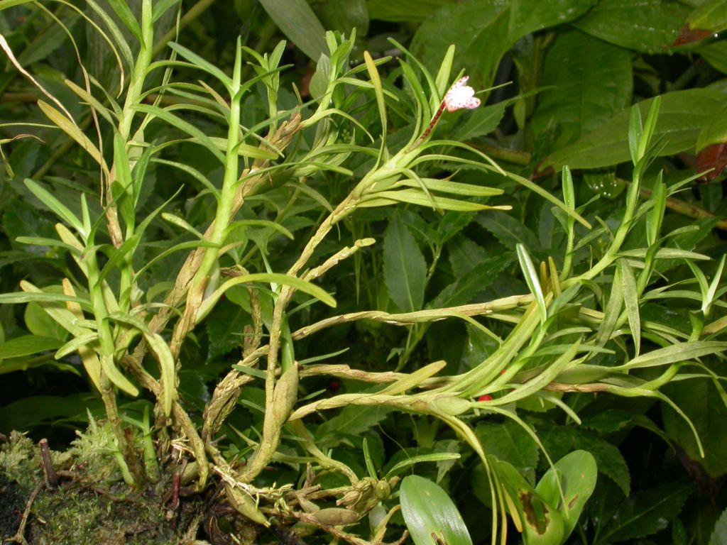 Found in Peru and Ecuador from elevations around 1500 to 3100 meters as a miniature sized, cool to cold growing terrestrial with slender, imbricating, branching stems with distichous, linear-ligulate, unequally bilobed apically leaves arranged in a ladder-like formation that blooms at any time of the year on an axillary inflorescence with almost globose flowers held close to the leaf axils.