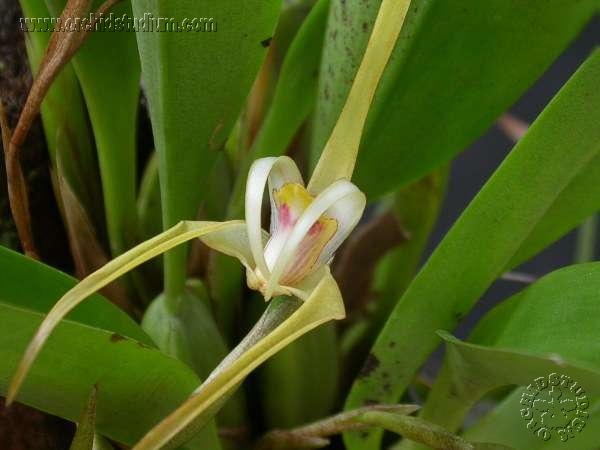 Found in Venezuela, Ecuador and Brazil in the Atlantic forest in southeast region on tree trunks, from sea level to 1200 meters as a small to medium sized, hot to cool growing epiphyte or terrestrial in semi-shade with oblong, compressed pseudobulbs enveloped basally by several imbricating sheaths with the uppermost leaf-bearing and carrying a single apical, linear-lanceolate, acute leaf that is attenuate into the pseudopetiole and blooms in the spring on 2, 6 to 7" [15 to 17.5 cm] long, single flowered inflorescence arising from the leaf bearing sheaths, enveloped completely by imbricating, loose, acuminate bracts and holding the sweetly scented flower just at leaf height.