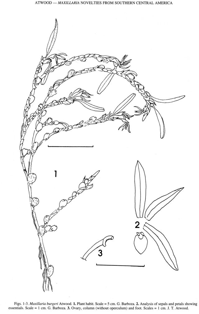References W3 Tropicos, Kew Monocot list , IPNI ; *Lindleyana 9(4): 233-236 Atwood 1994. drawing fide; Fieldiana Biology, Flora Costa Ricensis Family # 39 Orchidaceae, subtribes Maxillariinae and Oncidiinae Atwood & Mora 1999 drawing fide; Manual de Plantas de Costa Rica Vol 3 Hammel, Grayum, Herrera and Zamora 2003; Lankesteriana 7(3): 519 Blanco 2007 as Camarisium burgeri; Vanishing Beauty, Native Costa Rican Orchids Vol 2 Lacaena to Pteroglossa Pupulin 2020 as Camaridium burgeri photo fide