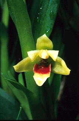 Found Honduras, Nicaragua, Costa Rica, Colombia, Venezuela, Surinam, Guyana, French Guiana, Ecuador and Peru in wet, montane forests at elevations of 100 to 1200 meters as a miniature sized, hot to cool growing, ascending, unifoliate epiphyte from with a rhizome with 2 to 3 distichous, imbricating sheaths, between each oblong-elliptic, compressed pseudobulb partially enveloped basally by a few scarious, distichous, imbricating leafless below and leaf-bearing above sheaths and carrying a single, lorate, acute, flat, gradually narrowing below into the conduplicate clasping base leaf that blooms in the spring and summer on a subsessile, single flowered inflorescence arising on a newly forming pseudobulb with close, short, tubular bracts arising from the basal sheaths.