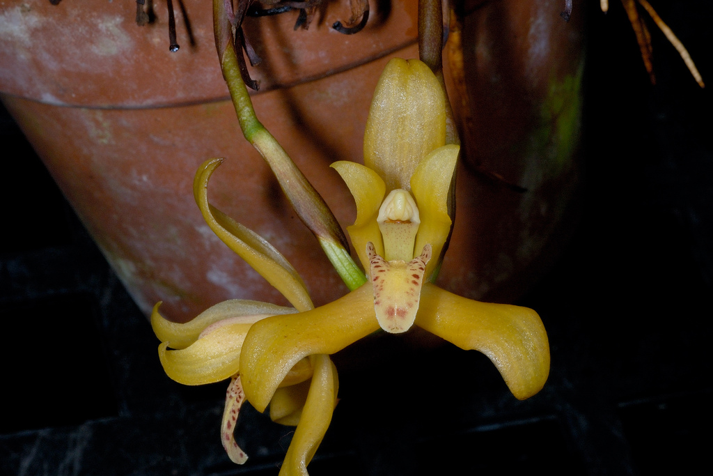 Found only in San Jose Province of Costa Rica at elevations around 2000 to 2500 meters as a small to just medium sized, cold growing epiphyte with ovate, compressed pseudobulbs, enveloped basally by inarticulate, triangular, nonfoliaceous sheaths, and carrying a single, apical, erect, narrowly elliptic leaf that blooms in the spring on a slightly fractiflex, 3.2 to 4" [8 to 10 cm] long, single flowered inflorescence enveloped completely by bracts and having floral bracts that are longer than the ovary.