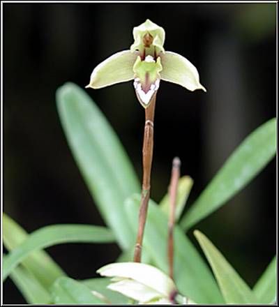 Found in Brazil as a miniature to small sized, warm to cool growing bifoliate species with ovoid, compressed, vertically rugose pseudobulbs that have a small, evanescent, basal and carries 2 apical, erect, linear-ligular, canoe-shaped, attenuate below into the pseudo-petiolate base leaves that blooms in the fall on a erect, 1.8" [4.5 cm] long, single flowered inflorescence arising on a mature pseudobulb and carrying fragrant flowers held above the leaves.