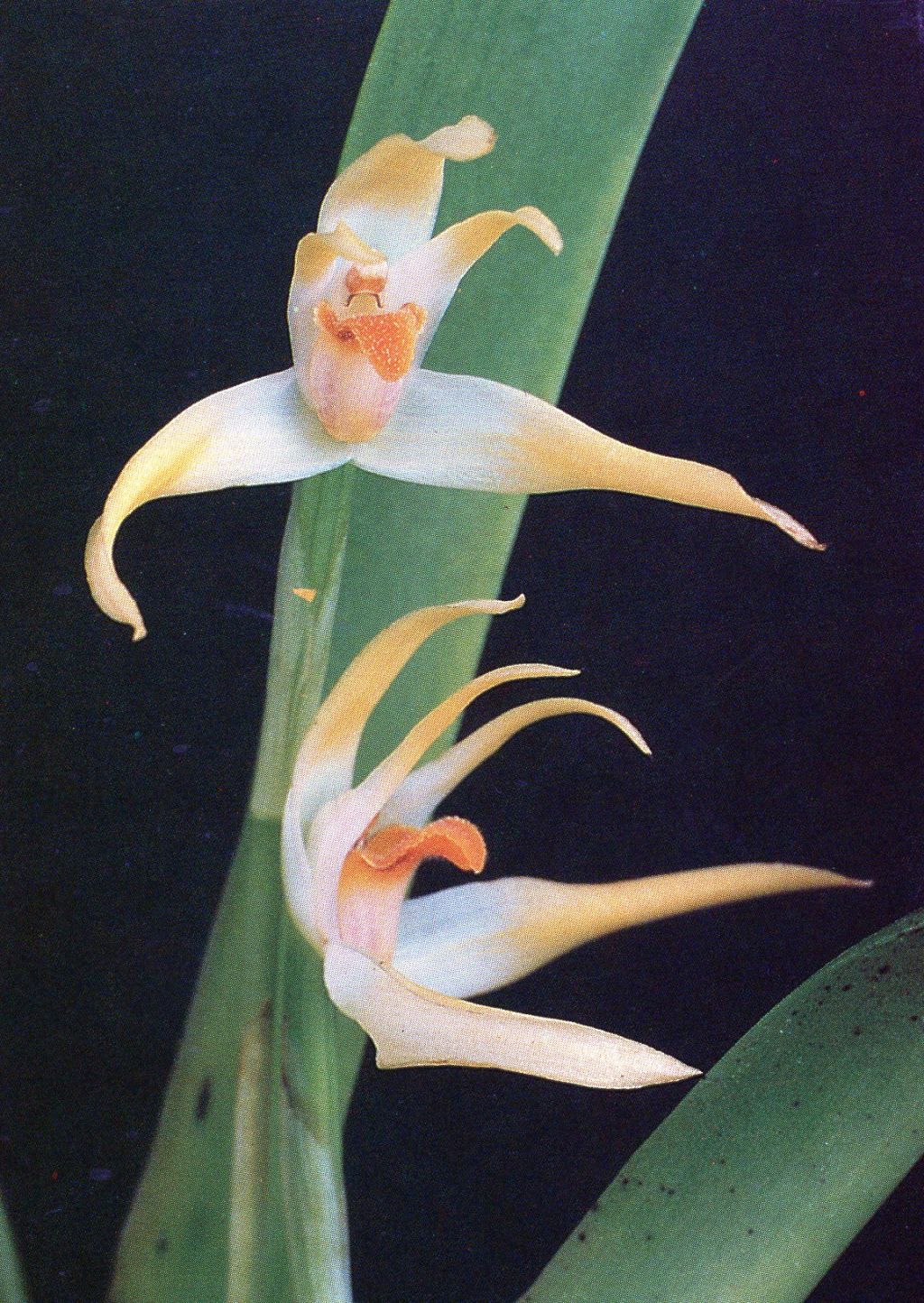 Found in Guyana, Venezuela, Colombia, Ecuador, Peru and northern Brazil in openings of dense cloud forests at elevations around 1100 to 2300 meters as a small to medium sized, cool to cold growing epiphyte with strongly compressed, finely grooved pseudobulbs enveloped completely by several imbricating, leaf-bearing sheaths that become deciduous with age and carrying a single, apical, erect, linear-oblong, strongly assymetrical apically, conduplicate towards the base leaf that blooms in the late winter and early spring on several at once, axillary, 3.6" [9 cm] long, single flowered inflorescence enveloped completely by pale green, lightly inflated sheaths.