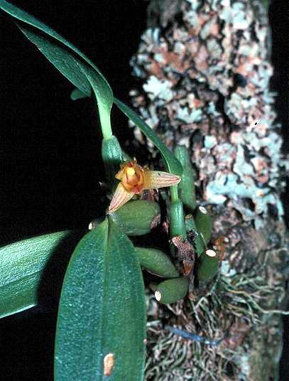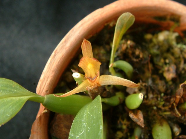 Found from Mexico, Guatemala, Belize, Honduras, Nicaragua and Costa Rica, as a mini-miniature sized, cool growing epiphyte occuring on oaks on dry hillsides and wet montane forests at elevations around 1350 meters, often in some full sun, with densely packed, cylindrical yet narrowing apically, slightly compressed pseudobulbs partially enveloped basally by a few scarious sheaths carrying a single apical, erect to slightly spreading, elliptic-ligulate, obtuse leaf that blooms in the summer on a short, basal, single flowered inflorescence arising on a mature pseudobulb with the flower held very close to the pseudobulbs.
