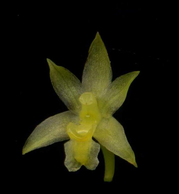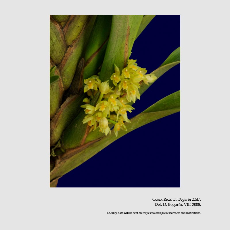 Found in Costa Rica and Panama in cloud forests at elevations of 1200 to 1500 meters as a medium to large sized, cool growing epiphyte with ovoid and single leafed pseudobulbs only at the base of the juvenile plant then in maturity, erect cane like stems arising with subcoriaceous, oblong, acute to obtuse to bilobate leaves that blooms in the fall on a fascile of several single flowered, 1.6" [4 cm] long inflorescence subtended by acute floral bracts.