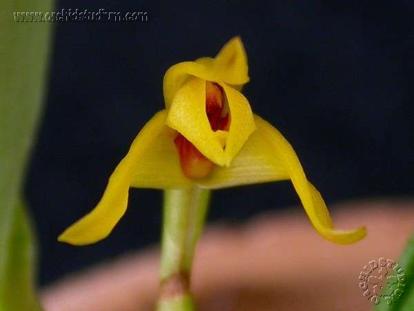 Found in Peru and Brazil at elevations around 1500 to 2950 meters as a small sized, cool to cold growing epiphyte with close set, ovoid-cylindric pseudobulbs enveloped basally by 1 or more pairs of sometimes leaf-bearing sheaths and carrying a single, apical, erect, oblong, acute, gradually narrowing below into the cuneate, stout, laterally compressed, petiolate base leaf that blooms in the spring and summer on a 3.4" [8.5 cm] long, single flowered inflorescence enveloped almost completely by several [5] loose, tubular sheaths and carrying fragrant, long-lasting flowers.