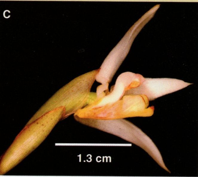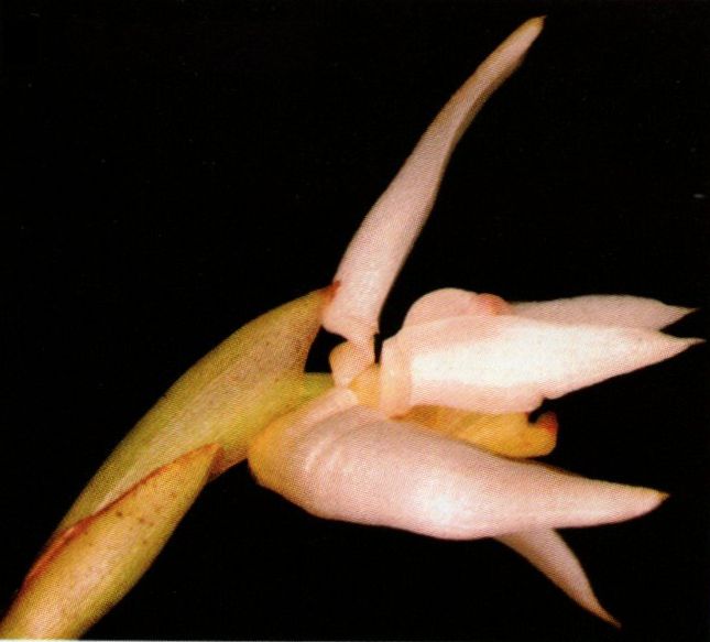 Found in Panama and Colombia on branches of tall trees without localities, most likely as a miniature to just small sized, cool, pendent growing epiphyte with a rhizome enveloped by tight fitting scarious, purple spotted sheaths, and .32 to 1.8" [.8 to 4.5 cm] between each ovoid to orbicular, biconvex pseudobulbs subtended by 2 to 3, foliaceous bracts and carrying a single, apical, thick, leathery, sublinear, acute, minutely naviculate, gradually narrowing below in to the conduplicate base leaves that blooms in the winter on a basal, peduncle 1.4" [3.5 cm] long, single flowered inflorescence enveloped by 7 tight, adpressed, imbricating, lanceolate, conduplicate, greenish bracts including the shorter to as long as the ovary floral bract